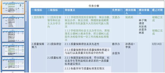 本科教育教学审核评估工作领导小组》,明确任务分工。书记、院长负责系统规划、检查督查,教学副院长负责总体部署安排、对外联络、自评材料组织及汇报、实验室及实验中心等考察准备,学生副书记负责学生宣传、培训、访谈等相关事务。下设学院审核评估办公室,教学副院长担任主任、成员由系主任、教学管理人员组成。