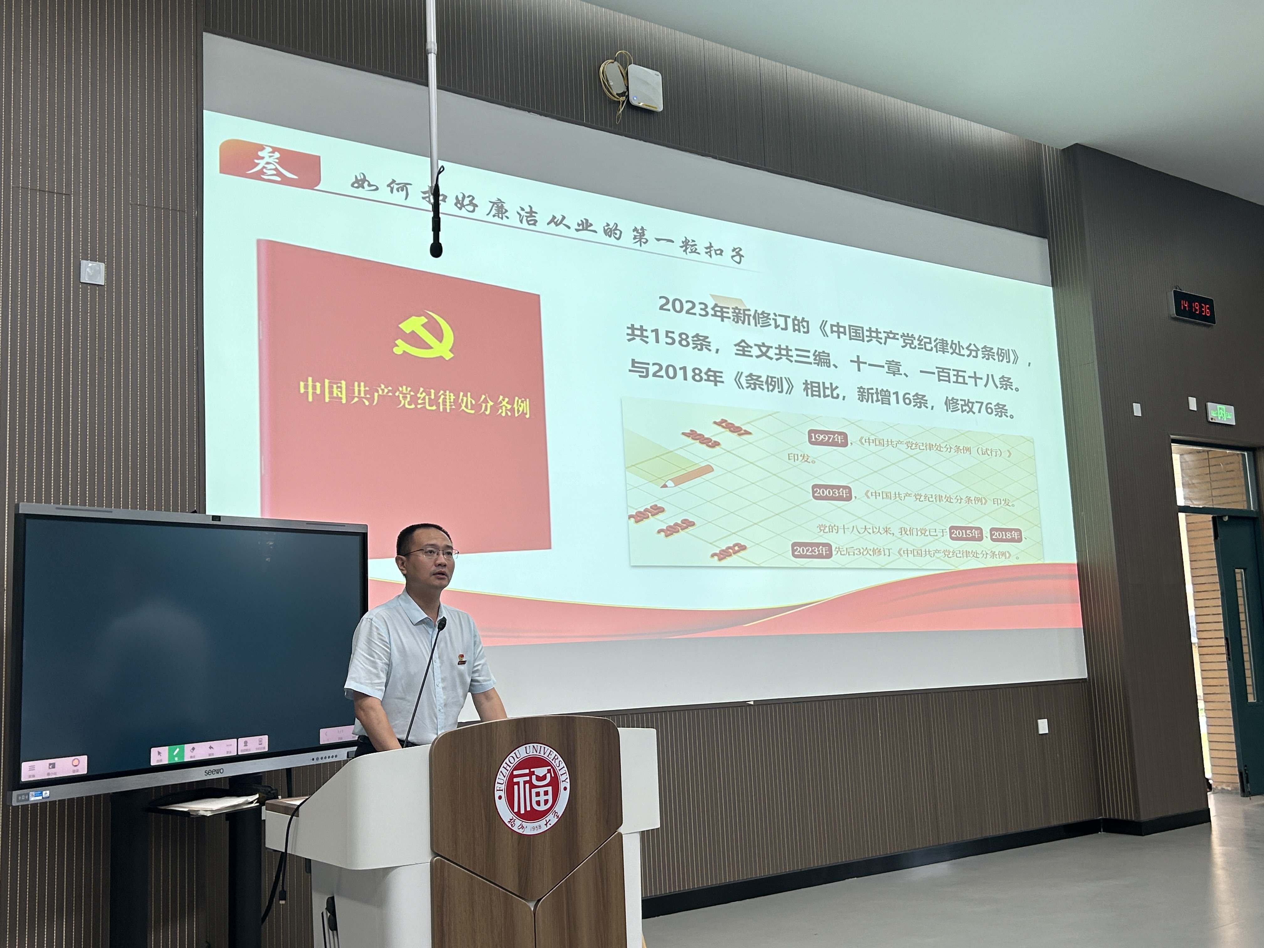 活动伊始,常凯副书记以党纪学习教育为主题,为毕业生党员讲述离校前“最后一堂党课”。他用生动的例子强调了毕业生步入社会之后,廉洁从业的重要性。他指出,党纪学习是每个党员的政治必修课,广大党员要筑牢理想信念根基,守住拒腐防变防线,扣好廉洁从业的“第一粒扣子”。他叮嘱毕业生党员:一是在临别之际,重温福大三种精神;二是要不忘初心,继续加强理论学习;三是要牢记使命,发挥先锋模范作用;四是祝一帆风顺,母校是你们永远的家。最后,他寄语全体毕业生:在未来的人生征程中,愿所有的毕业生党员都能够严守党规党纪,坚定理想信念,勇于担当使命,牢记全心全意为人民服务的宗旨,让青春在祖国和人民最需要的地方绽放绚丽之花!