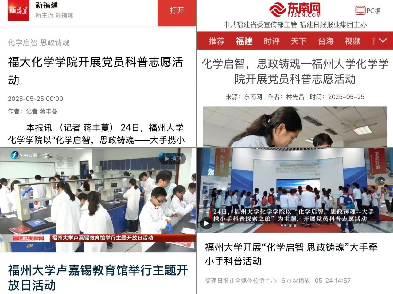 以“化学启智,思政铸魂——大手携小手科普探索之旅”为主题,开展党员科普志愿活动,来自福州市钱塘小学的50多名学生走进大学校园,开启了一场充满趣味与知识的科学探索之旅。活动得到福建日报、东南网、福建卫视新闻等多家主流媒体的报道。