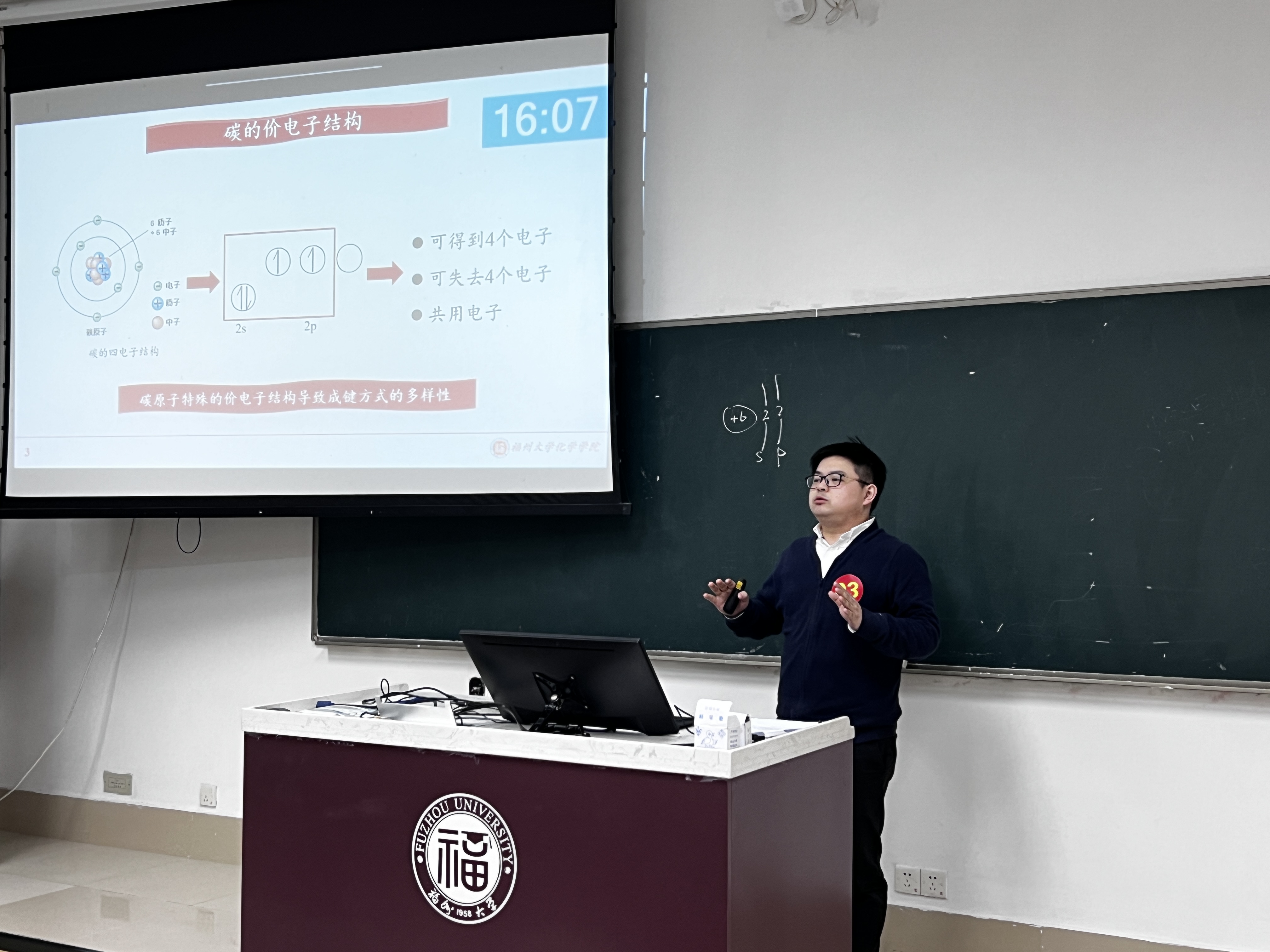 青年教师的教学风采。竞赛评委根据参赛教师的授课教案、教学组织、教学内容、语言与教态、板书和教学手段等各方面的表现情况,进行实名制打分。经过激烈角逐,无机系的阳灿老师、物化系的孙财老师脱颖而出,分别获得一等奖和二等奖的好成绩。