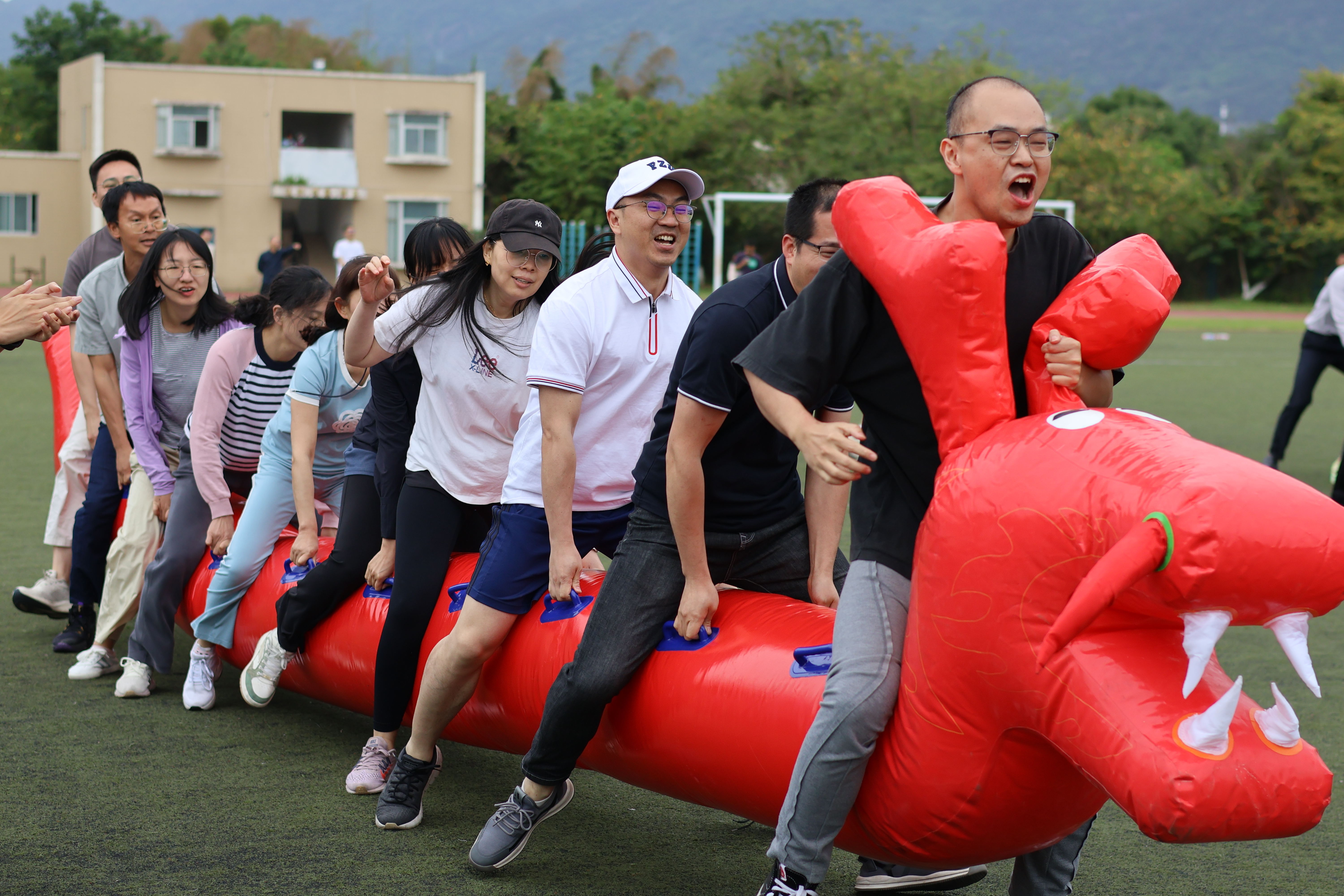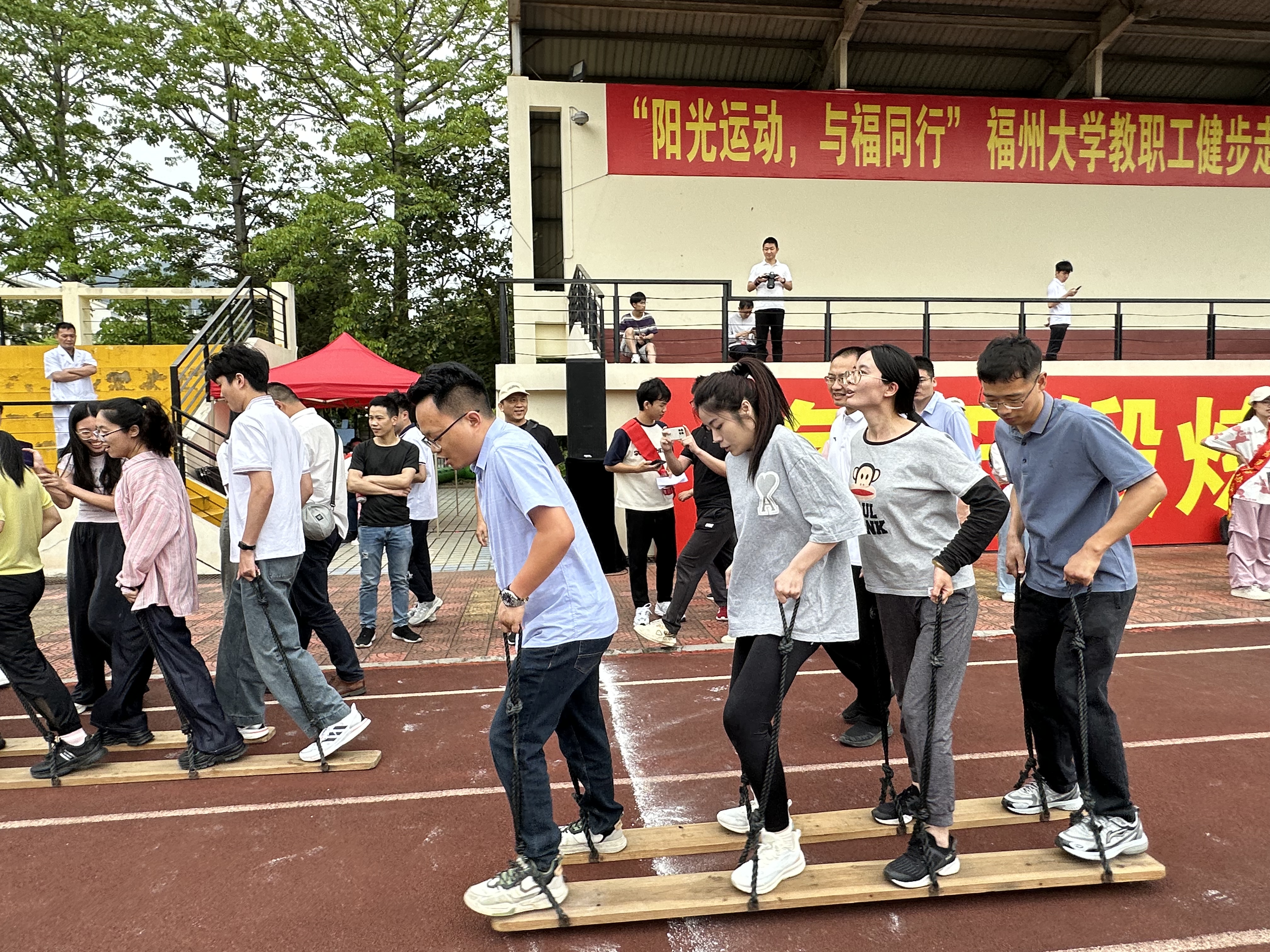 23支队伍,500余名教职工,一场集竞技、娱乐、团队合作为一体的“体育盛宴”在健步走活动后火热上演。跳绳、同舟共济、提绳踏板、龙行天下,老师们团结协作,互相鼓励,全力以赴,体验运动的乐趣。跃动的身影在赛场上穿梭,每次努力都凝聚着汗水与智慧。观众席上,领导与其余老师们同样热情高涨,为参赛选手加油助威,现场气氛热烈而融洽。
