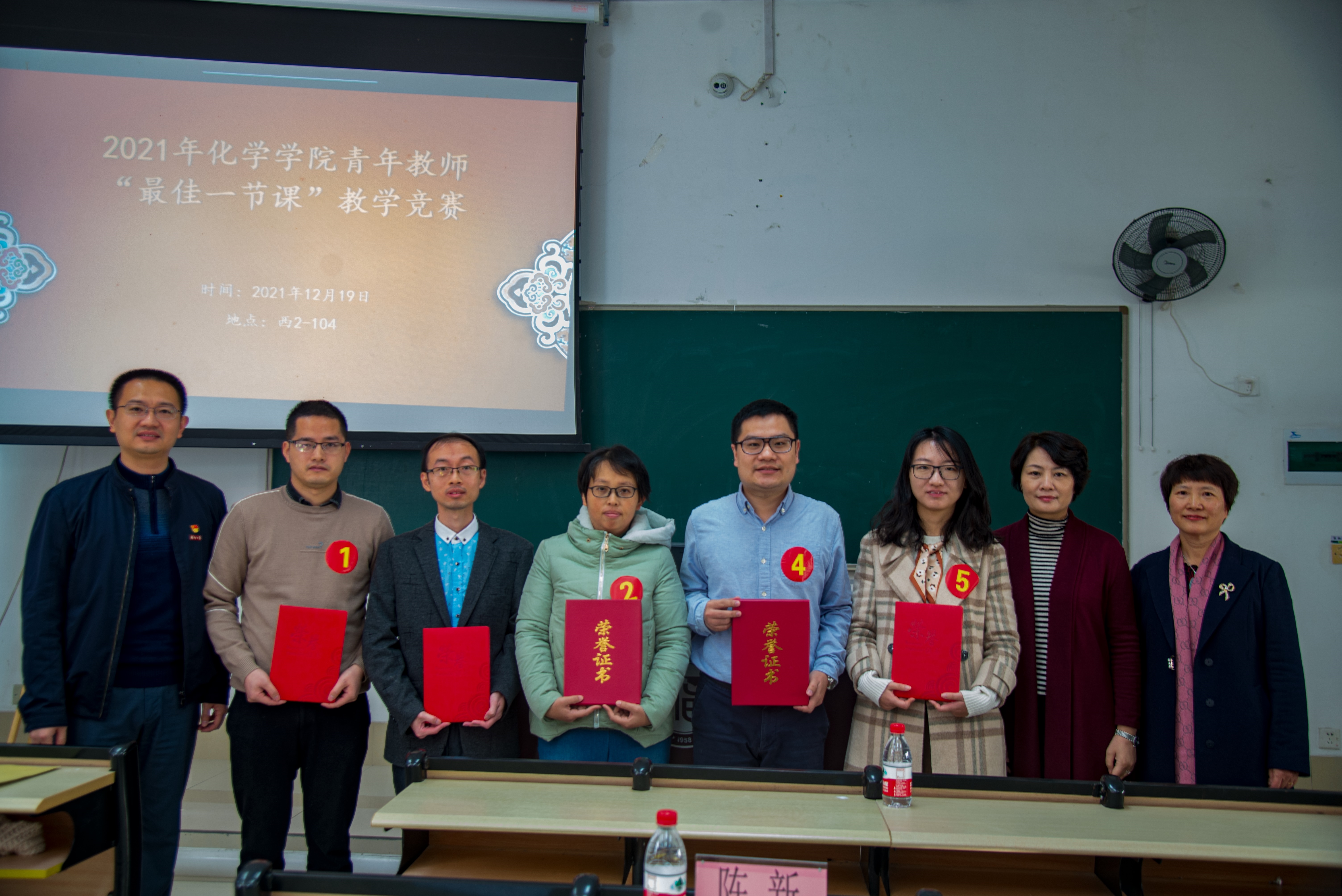 青年教师的教学风采。竞赛评委根据参赛教师的授课教案、教学组织、教学内容、语言与教态、板书和教学手段等各方面的表现情况进行实名制打分。组长阮奇老师对每位比赛选手的表现作了精彩点评,从课程思政到案例教学,从语言神态到教具选用,阮奇老师都做了细致入微的指导,在场师生受益匪浅。经过激烈角逐,物化系的汤禹老师、有机系的李毅老师脱颖而出,分别获得一等奖和二等奖的好成绩,其余三位老师获得三等奖。