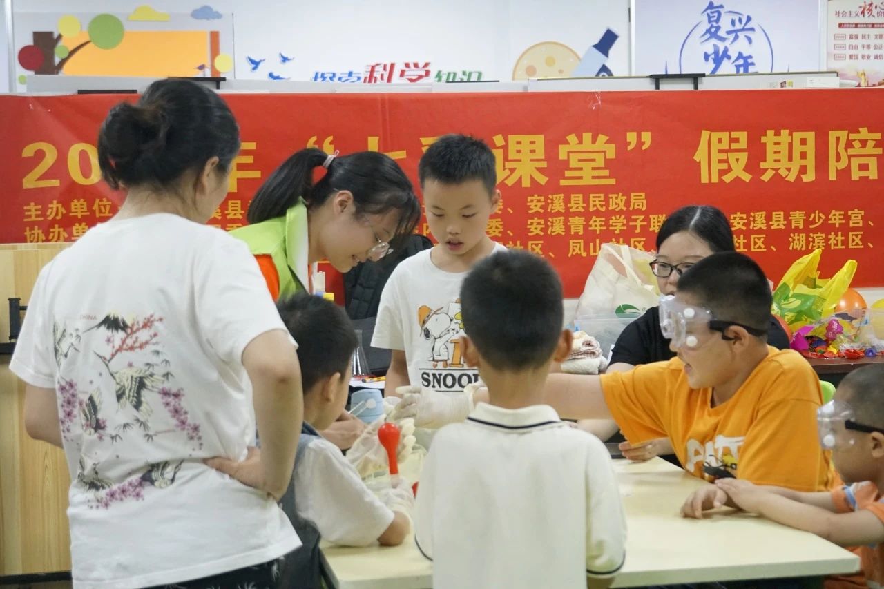 “科普小酰酚”实践队前往福建省安溪县,与中共安溪县委人才办、共青团安溪县委、安溪县民政局等共同开展“七彩课堂”暑期陪伴活动,并与安溪唯尚心青年志愿者协会一同开展“奉献童心 志愿同行”暑期公益课堂。