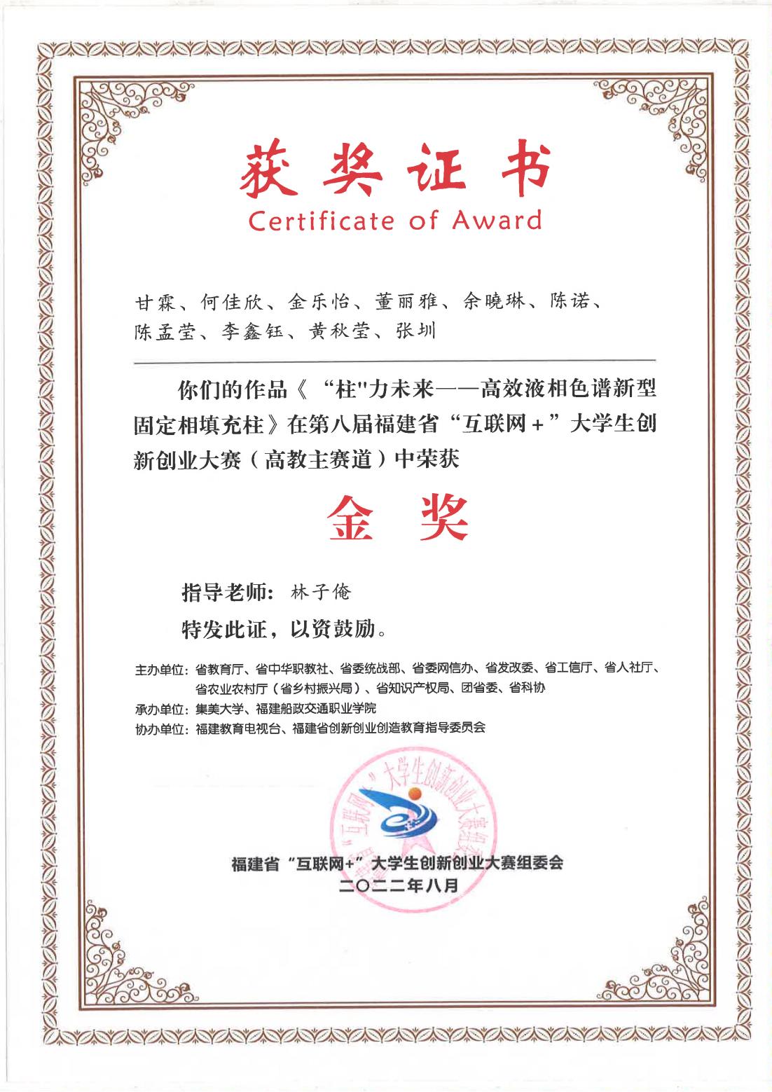 何佳欣 获第八届福建省互联网+大学生创新创业大赛省赛金奖