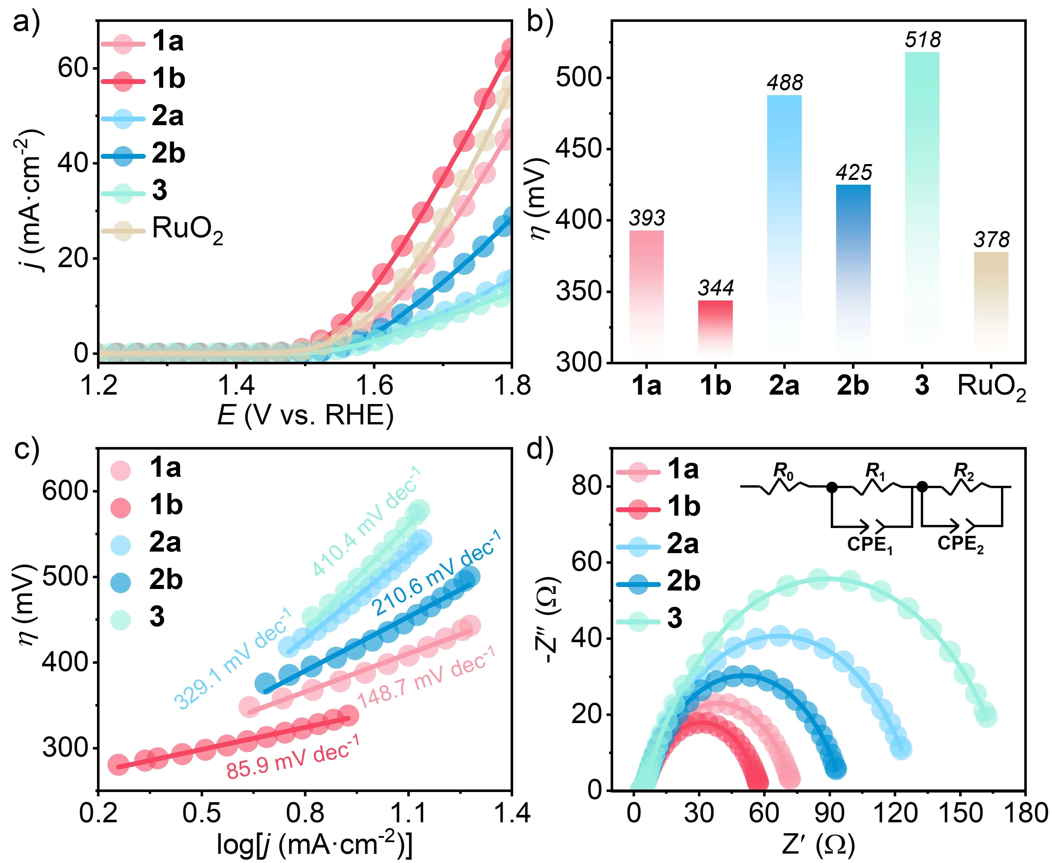 图2. OER的电催化性能。a) 样品1a、1b、2、3a、3b和商用RuO2在氧气饱和的0.1 M PBS溶液中的LSV曲线,扫描速率为5 mV s-1;b) 10 mA cm-2电流密度下的过电位;c) Tafel斜率;d) 在1.60 V(RHE)的外加电压下获得的奈奎斯特图与和对应等效电路图(插图)。