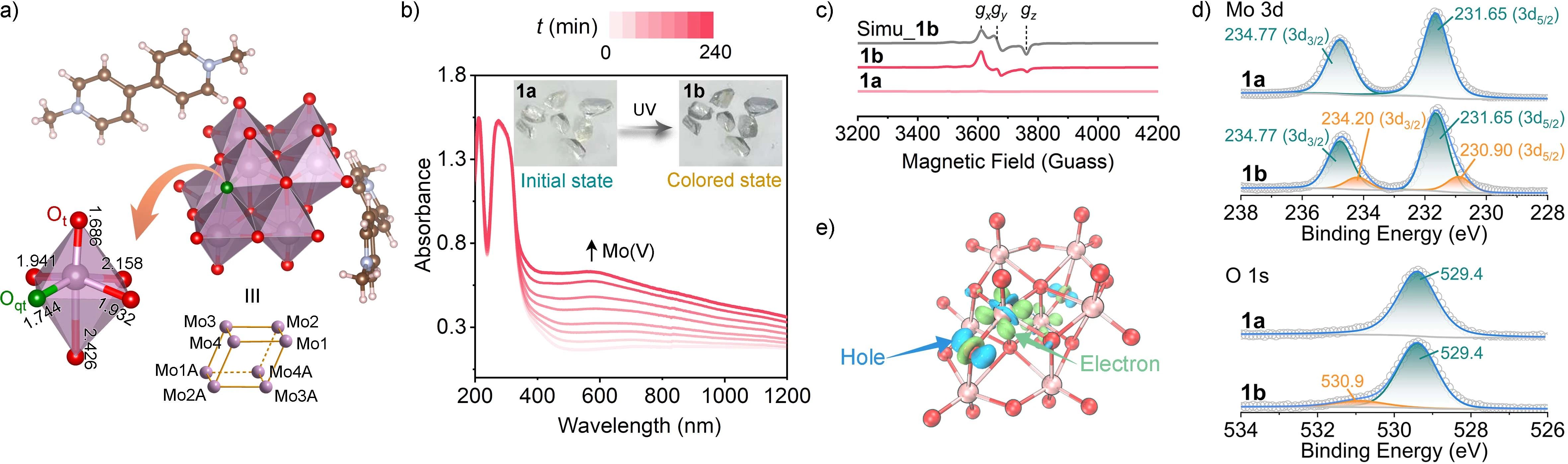 图1. 多钼氧酸盐1。a) 分子结构;b) 时间依赖的紫外-可见吸收光谱,插图:颜色变化;c) 1a、1b和模拟1b的EPR谱;d) Mo 3d和O 1s的XPS芯级谱;e) Mo8的电子密度差,绿色和蓝色分别代表电子转移后的电荷积累和减少,等值面值为0.01 e-Å-3。