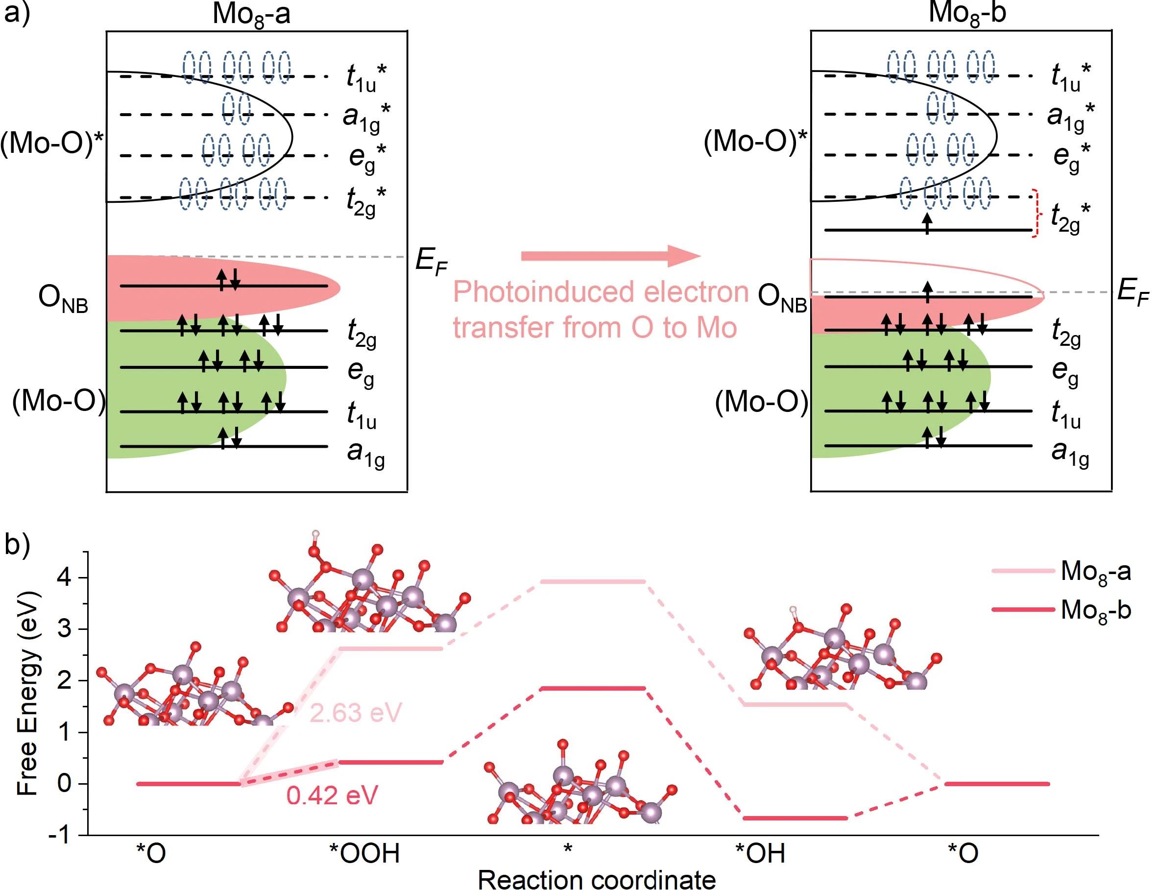 图3. 辐照后Mo8从初始状态到电荷分离状态的电子构型变化示意图,ONB表示氧中的非键电子,EF表示费米级;b) 在1.23 V的外加电位下,Mo8的OER阶自由能。