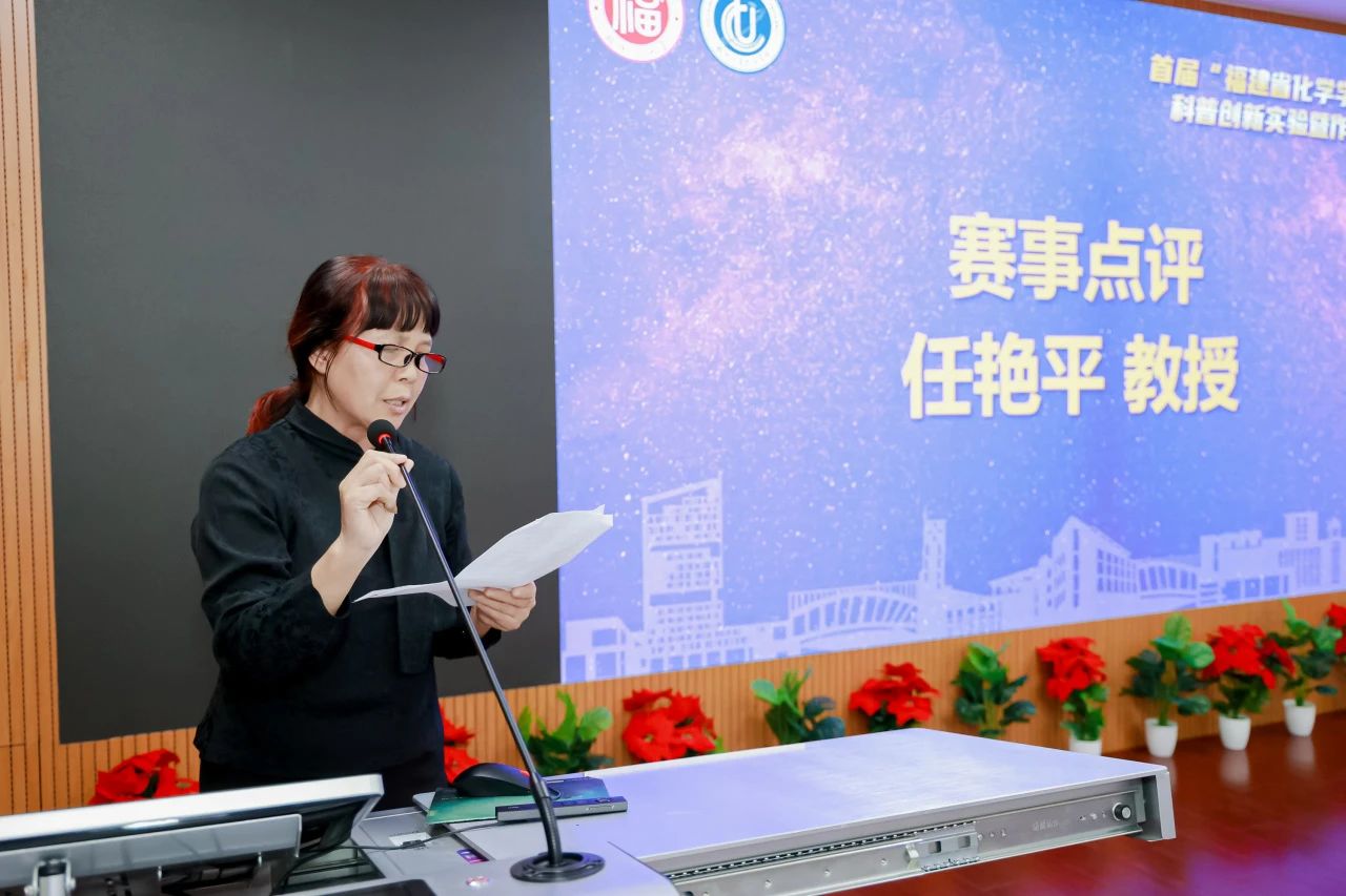 首先,厦门大学国家级实验教学示范中心(化学)荣誉主任任艳平教授,对本届大赛进行了精彩的点评。她指出,本次大赛作品充分体现了化学不断创新的灵魂和无限变化的魅力,卢嘉锡科学精神宣讲作品更是让我们身临其境地感受了嘉锡先生的创新精神和崇高品质。大赛的举办展示了青年学子勤奋好学、积极向上的精神风貌,达到了竞赛的目的。希望青年学子能够再接再厉,引领和推动福建省化学科普事业的进一步发展。