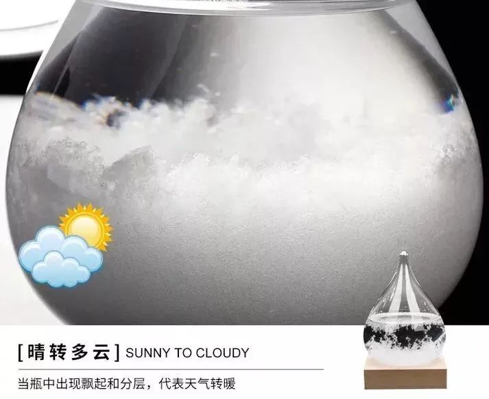 天气瓶又称风暴瓶(Storm Glass),是可以用来对天气进行一定程度预测的工具。密闭的玻璃容器中,装入数种化学物质组成的透明溶液,根据外界温度改变,瓶内会展现出不同型态的结晶,预报天气的变化。