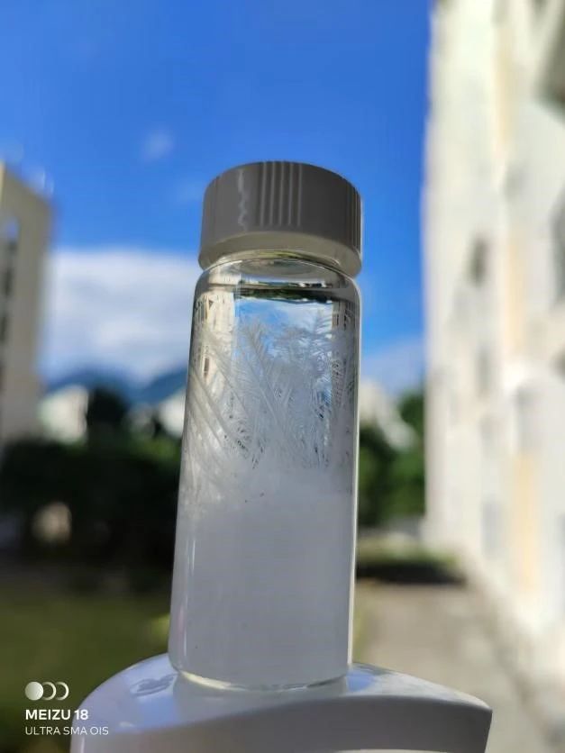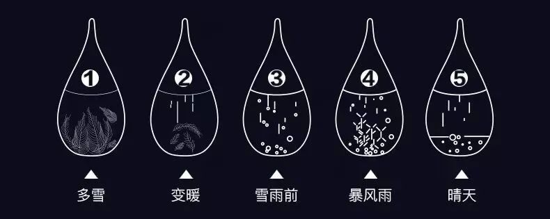 混匀完毕后,瓶内便开始析出洁白的晶体,犹如澄澈的天空中,漫天白雪扑洒而下。天气瓶静置一段时间后,雪白的晶体停止了增长,开始慢慢沉淀、溶解,织出一个个让我们赞叹连连的晶型。