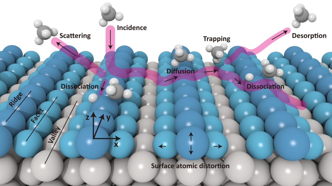 图2. 甲烷在 Pt(110)-(2×1)表面的散射、捕获、扩散、解离和吸附示意图。