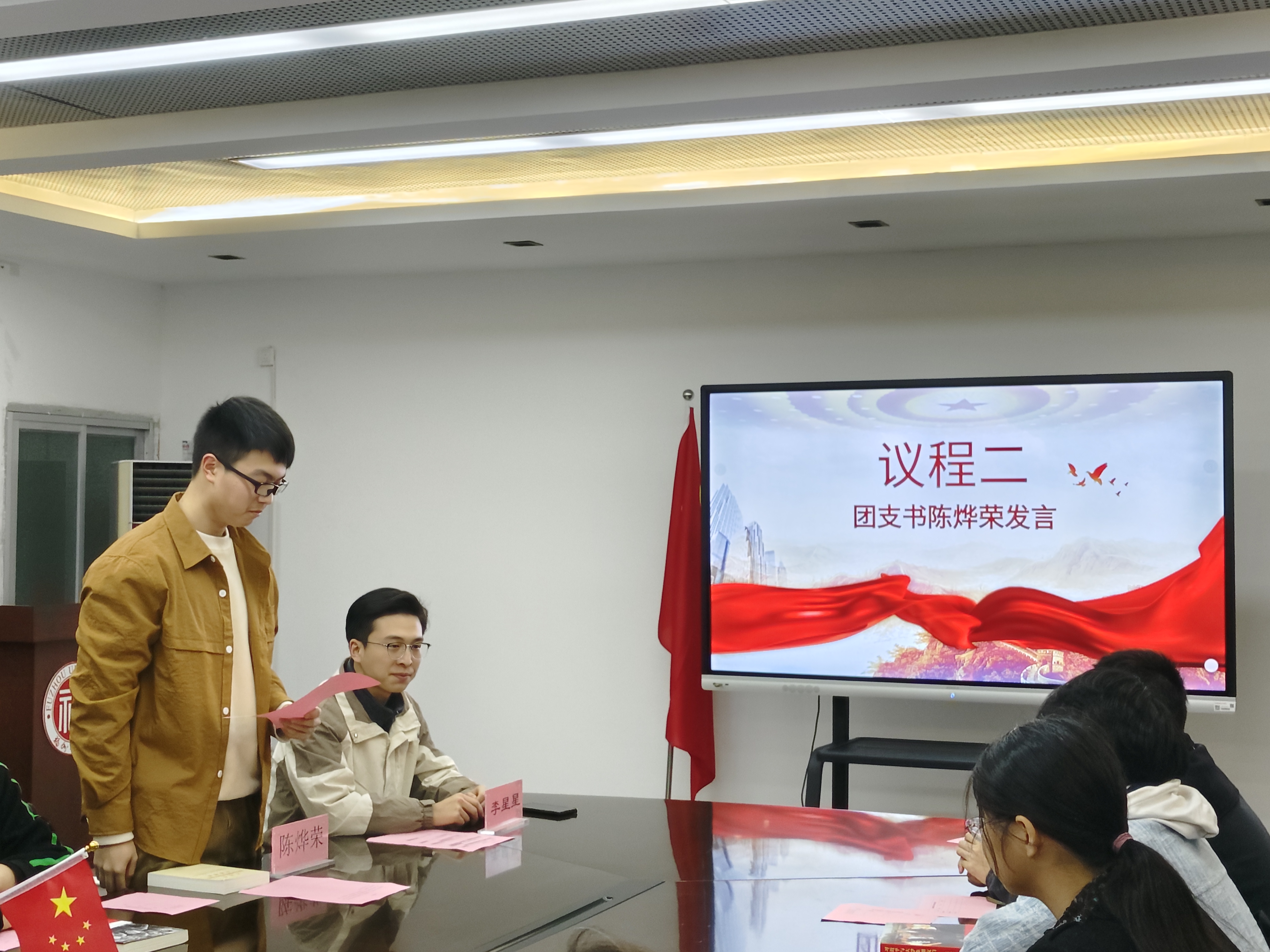 2023级嘉锡拔尖班团支部书记陈烨荣同学围绕“思想旗帜”“坚强核心”“挺膺担当”“强国复兴”等方面汇报了团员和青年主题教育开展和支部建设情况。他表示,虽然支部取得了一些成绩,但还存在许多不足,后续会加强反思,改进工作,努力将支部建设成守规范、有活力、敢作为的集体。