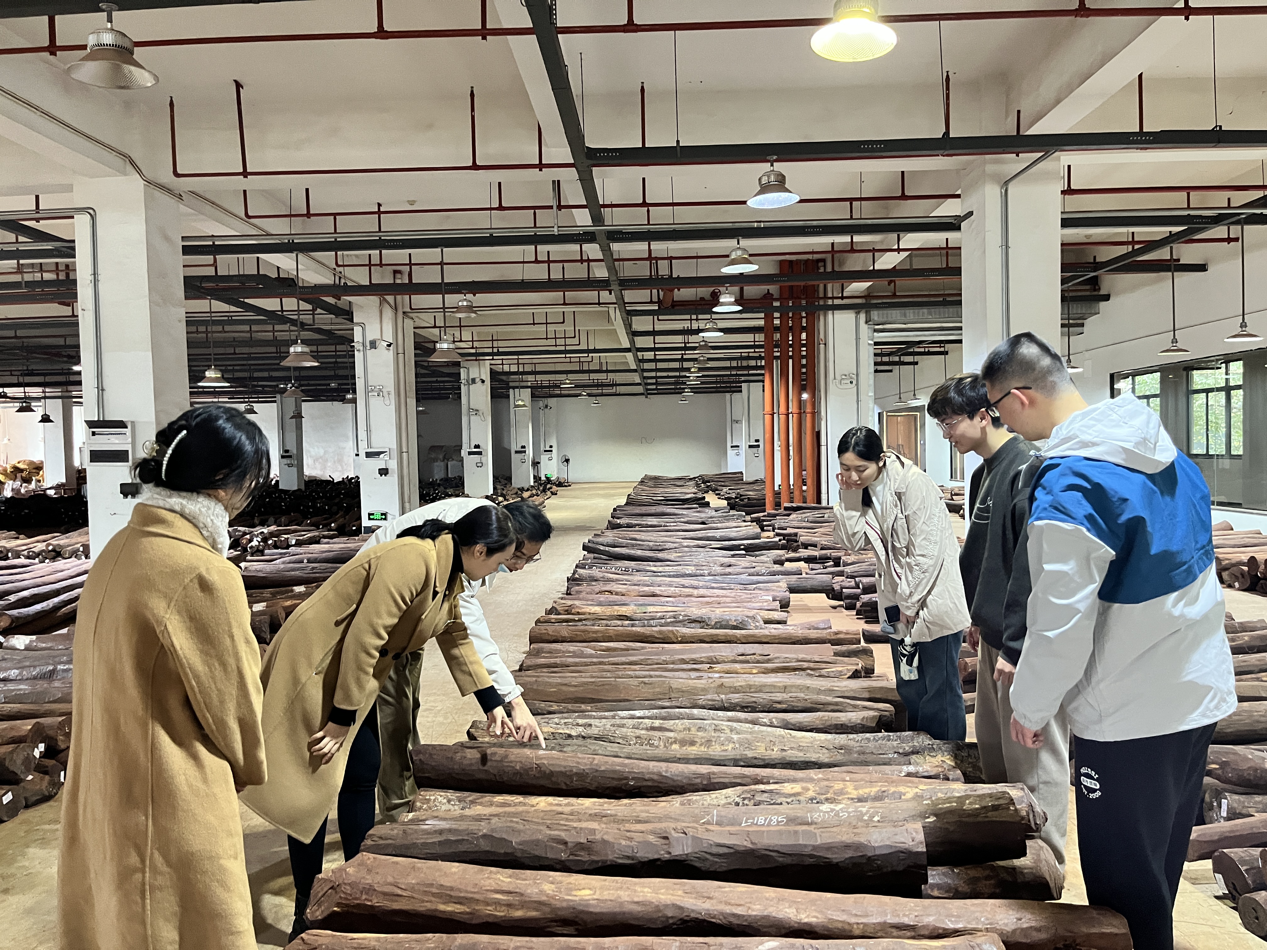 随后实践队员们参观了“小叶紫檀原料间”,现场观看了红木家具生产的全过程。“一寸紫檀一寸金”,在讲解员的介绍下,大家对古典红木家具原材料的性质以及选材的要求有了进一步的了解,纷纷对精湛的工艺技术、各具特色的红木家具和工艺品赞叹不已。