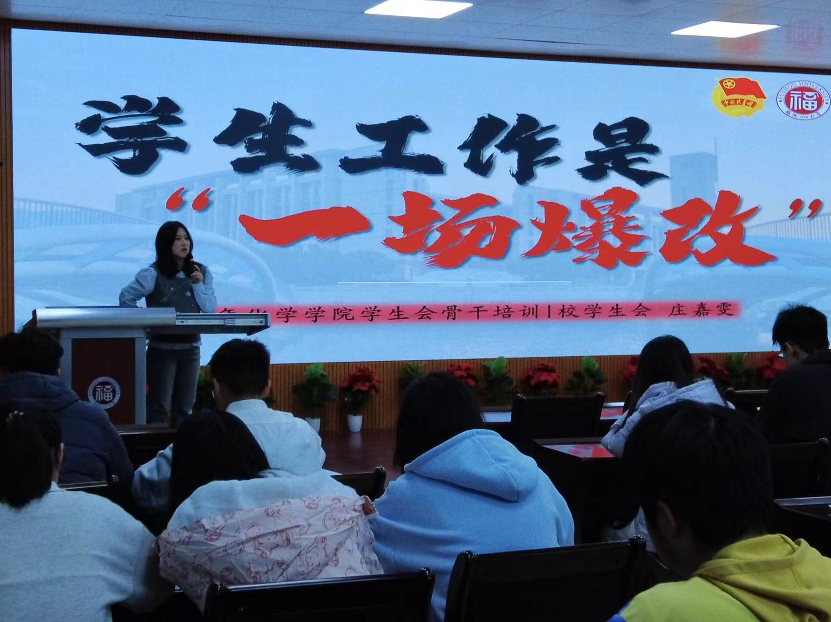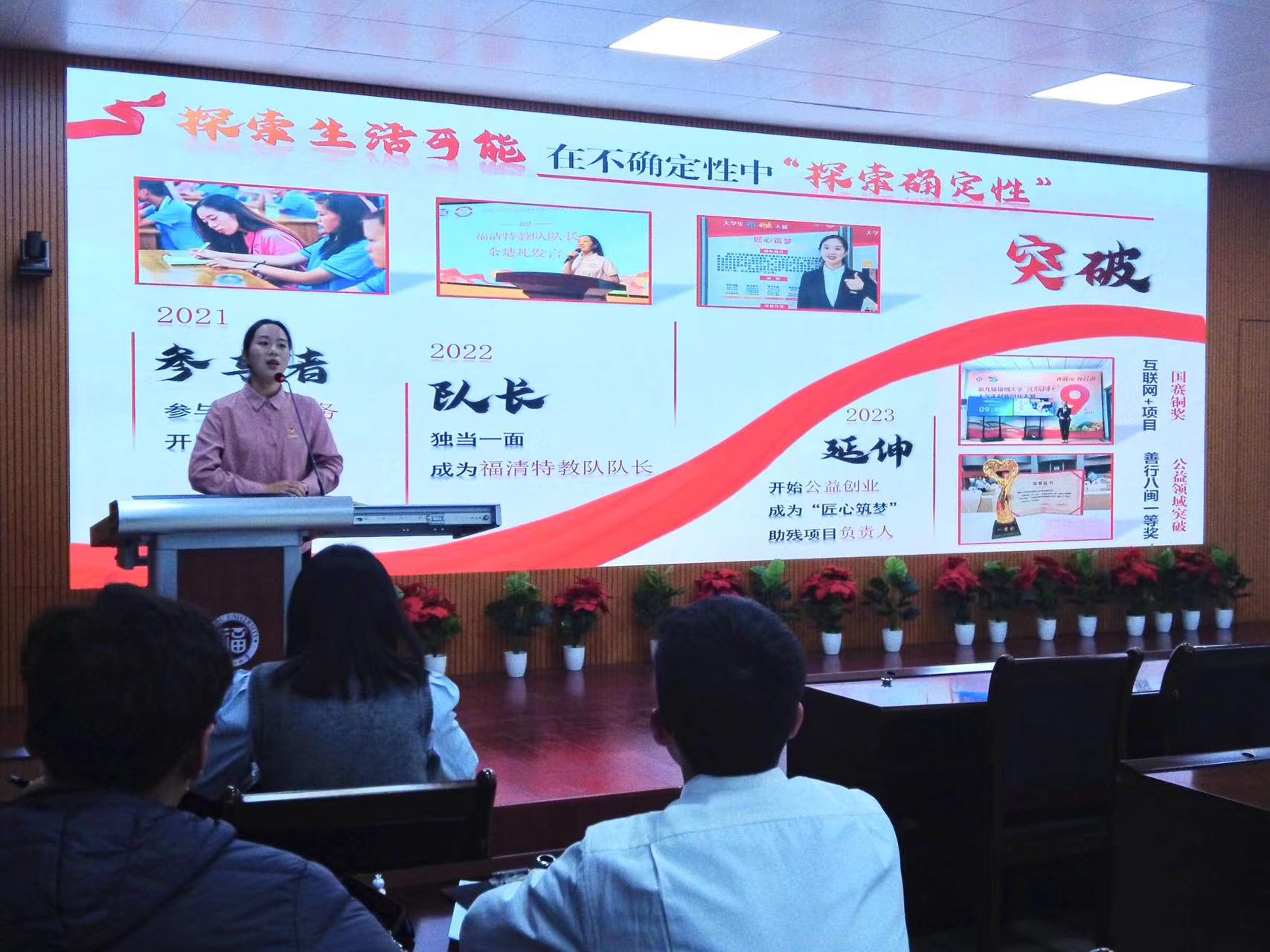 历任校长奠定的“大爱”思想为福大学子们提供了一流的发展平台,希望在场的学生骨干能够在个人成长、创新创业、学业发展等多方面提升自我,成为一个全面优秀的嘉锡青年。她强调,身为一名学生骨干,在面对问题时要具有不惧难不畏难的精神内核,在学生工作中切实地为同学服务。