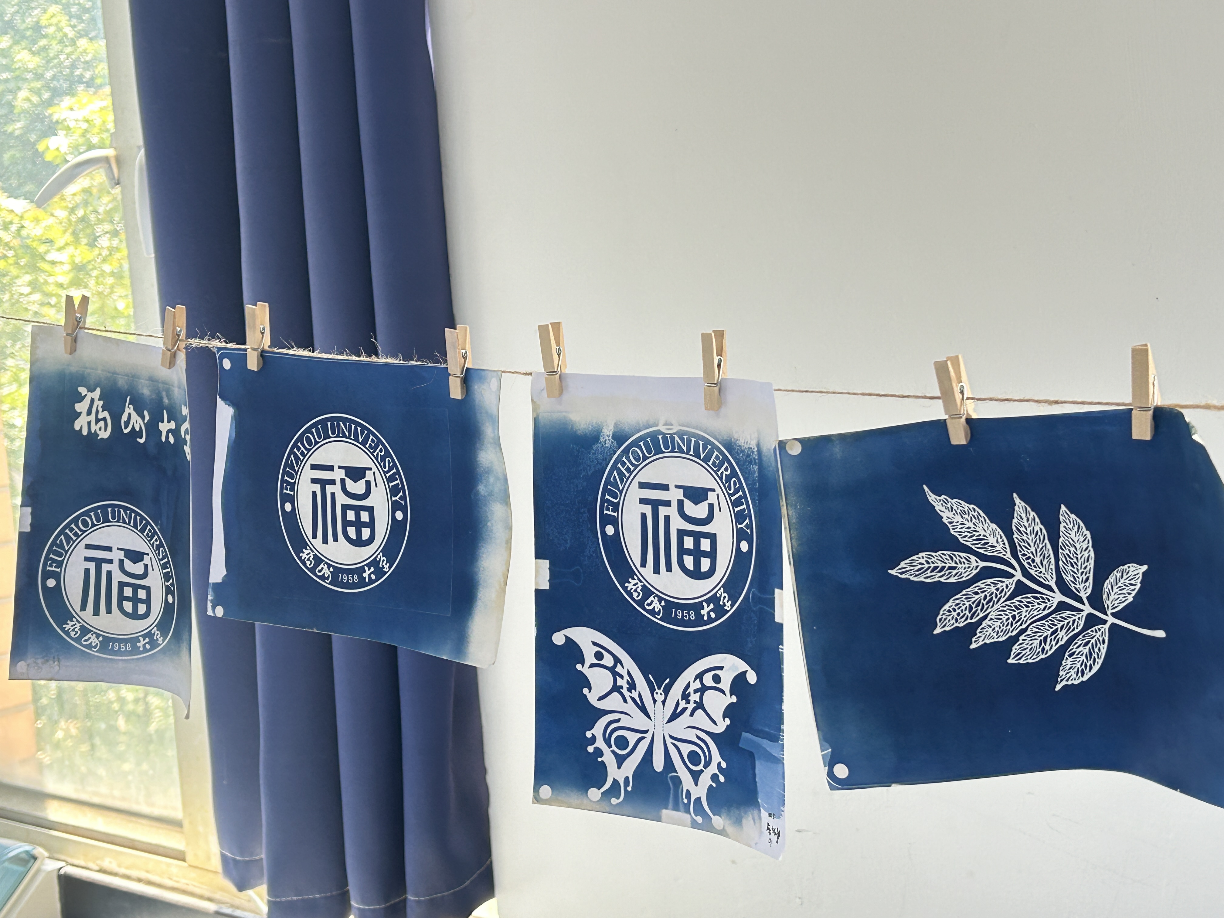 于蓝白之间,化学和摄影的跨界表演。同学们在老师们的指导下迫不及待地开始实验,小心翼翼地将感光液均匀地涂抹在底板上。避光晾干后,他们发挥想象力和创造力,将化学反应的理学之美与图像设计的艺术之美相结合,利用各式各样的“负片”制作出独属于自己的“蓝精灵”。随着作品在清洗后显现出漂亮的普鲁士蓝色,小朋友们为神奇的化学变化惊叹不已,欢声笑语中充满了对科学的向往与期待。