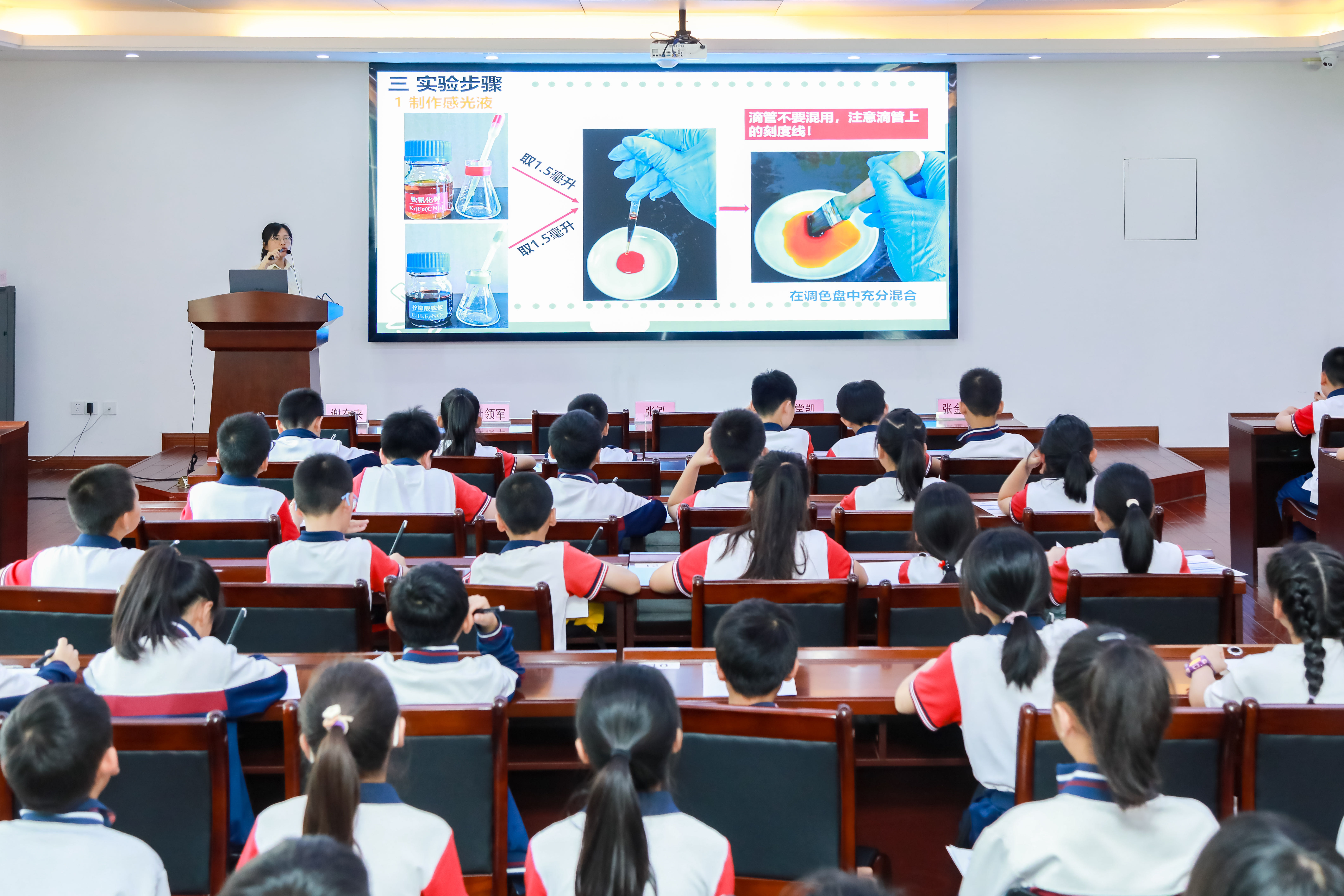 “老师,纸张离开紫外线照射后图案会消失吗?”“老师,如果两种溶液加的量不相等的话实验会失败吗?”充满好奇与不解的小朋友们纷纷提问,郭老师耐心地一一进行解答。她提醒同学们,实验室是进行科学探索的重要场所,希望大家在掌握实验原理和实验室安全常识的前提下,尽情体验科学带来的无穷魅力和创造的无限乐趣。聚精会神的小朋友们连连点头,提笔记录。
