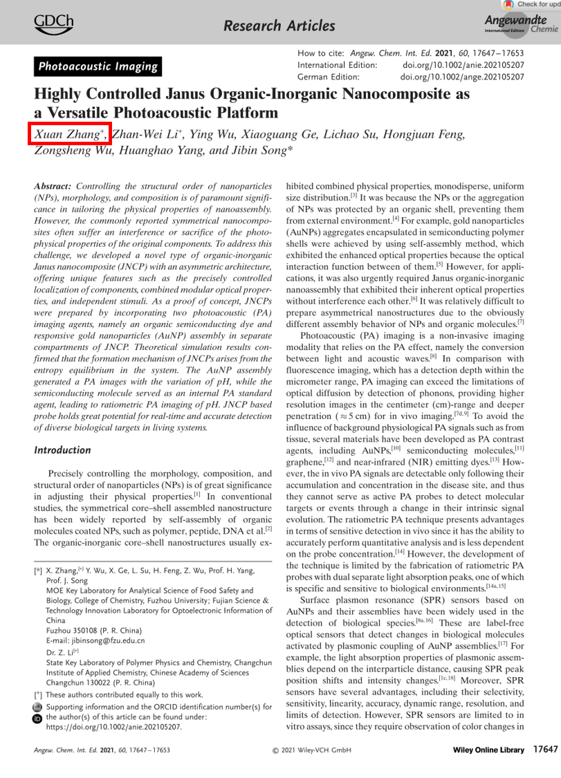 张璇:我在研究生期间的研究方向是不对称纳米探针在活体疾病诊断与治疗方面的应用,这也是一个交叉集成了化学、医学、材料学、生物学、光学等多门学科知识的新兴研究方向。关于科研方向的选择,首先还是要感谢我的导师宋继彬研究员的言传身教与悉心指导,也是导师带领我走进了科研的大门。带着对研究生生活的好奇与憧憬,我慢慢开始接触科研,了解科研。