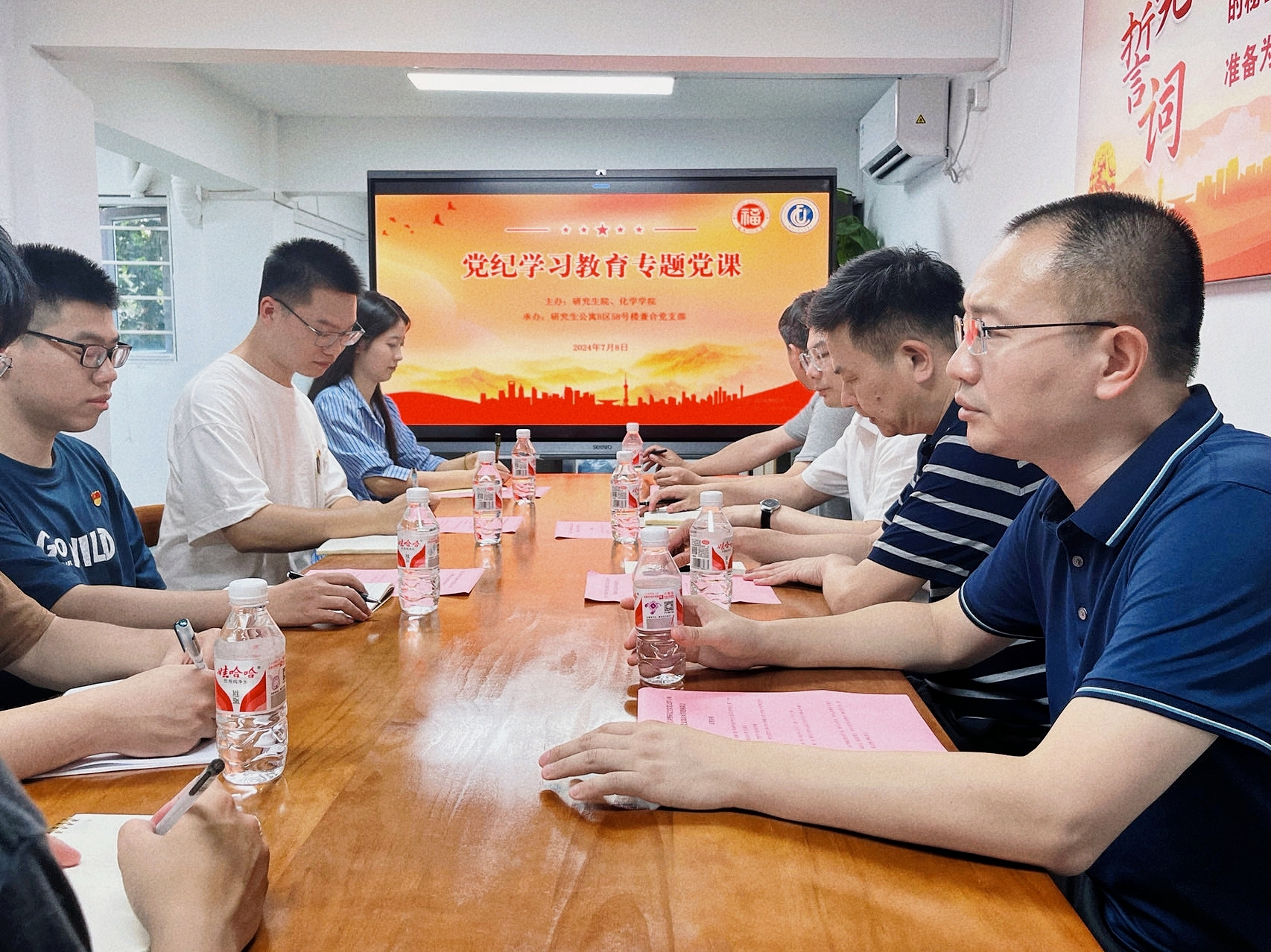 为深入学习贯彻习近平总书记关于党纪学习教育的重要讲话和重要指示精神,引导广大党员干部认真学习新修订的《中国共产党纪律处分条例》,做到学纪、知纪、明纪、守纪,7月8日下午,研究生院党支部与58号楼兼合党支部于“一站式”健身活动共享空间党团活动室,成功开展了党纪学习教育专题党课暨党建共建活动。研究生院党支部书记、研究生院黄剑东常务副院长,58号楼楼层指导员、研究生院黄文峰副院长,木瓜视频