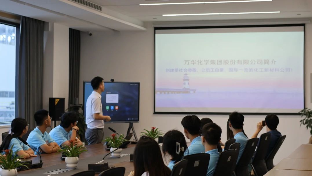 首先,实践队成员和万华化学代表在411会议室开展座谈,万华团队代表向实践队全体队员详细介绍了万华化学的发展历程、木瓜视频、业务领域和未来规划等,展现了万华化学强大的技术实力和对创新创业的不懈追求。