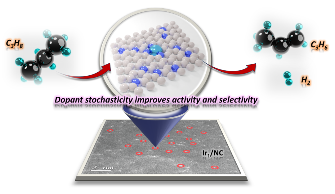 图1 单原子催化剂中掺杂物种的两种分布模型,致密掺杂模型和随机掺杂模型(上图)。增加随机分布的N掺杂物种可同时提升丙烷脱氢反应的活性和选择性(下图)。