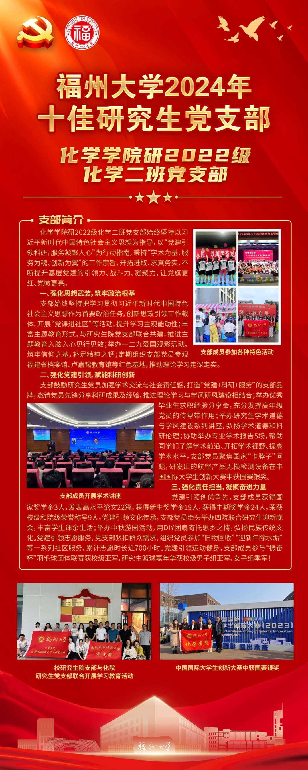 一个支部就是一座堡垒,一名党员就是一面旗帜。学院党委将以此次获奖为契机,进一步聚焦新时代研究生的新特点新需求,把握新时代思想政治工作规律,把党建和思政工作融入人才培养全过程,凝聚育人合力,优化设置研究生党支部,建强研究生党支部和党员队伍,不断提升研究生党建工作水平,促进研究生教育高质量发展,为推动学校党建事业再上新台阶作出化院贡献!