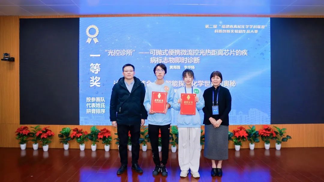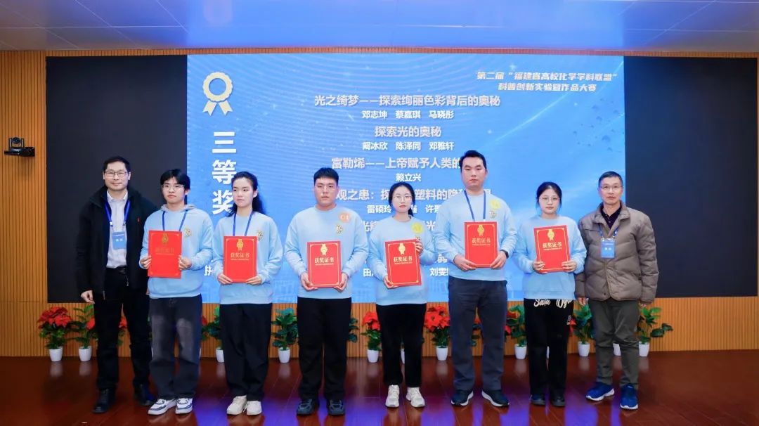 随后,魏巧华研究员代表组委会宣布了第二届“福建省高校化学学科联盟"科普创新实验暨作品大赛获奖公示名单并进行颁奖。其中,一等奖2项、二等奖4项、三等奖6项、优秀奖若干项。