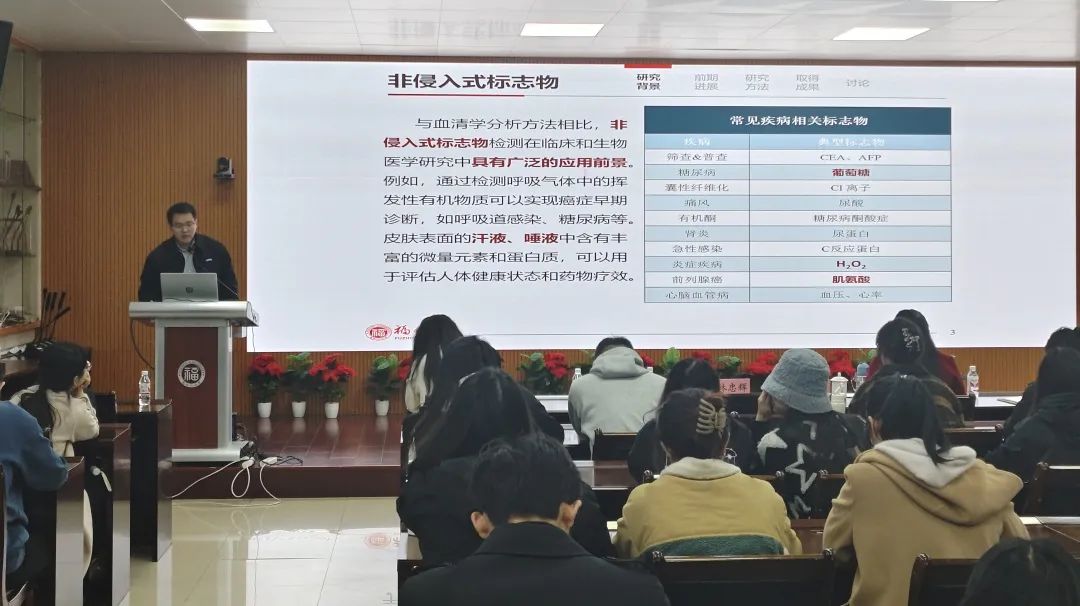 于智超师兄深入浅出地引领同学们探索了“新型多功能纳米酶的设计及其在生物传感中的应用”这一前沿课题,从研究背景到成果展示,师兄的讲解逻辑清晰、覆盖全面。随后,他更是针对研究生群体普遍在科研上会遇到的几大难题,例如创新点的挖掘、数据的优化和期刊选择等,分享了自己的解决策略,给在场同学们以启发和鼓舞。