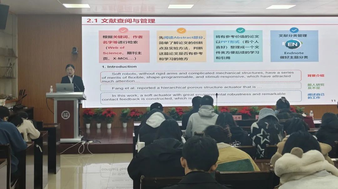 “唯有坚持不懈,才能迎来胜利的曙光。”李晴晴师姐与同学们分享了她的科研经历以及心得体会,激励大家要敢于直面科研道路上的重重挑战,不畏艰难,坐稳科研“冷板凳”。此外,师姐还分享了一系列实验小tips与常用的科研工具,让在场的每一位同学都收获满满。
