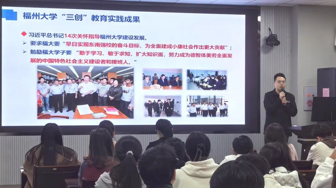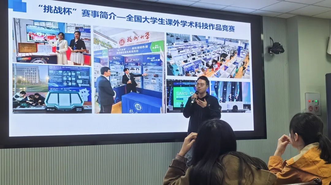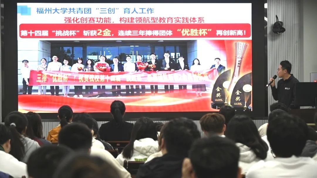随后,谢俊慧老师回顾了过去两年我校在“挑战杯”赛事中的佳绩。从23年获全国特等奖和学校连续两届获挑战杯创业计划竞赛金奖,到24年获两项金奖,连续三年捧得团体优胜杯,成功获全国的擂主。在这一过程中,福大青年秉持着精益求精的精神,展现了强健的意志力,在卢嘉锡先生精神的带领之下,贡献创新方案,为社会发展和国家进步交出福大青年的答卷。