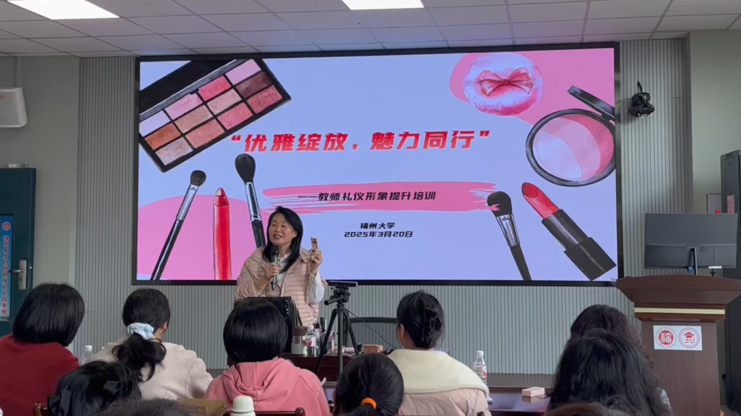 活动特邀福建省歌舞剧院人物造型设计师陈君玉作为主讲嘉宾,结合教师的职业特点展开专题培训。培训伊始,陈君玉老师深入浅出地向大家介绍了化妆的基础知识,从“各种化妆工具的使用方法”“化妆品的挑选与使用技巧”到“日常化妆的基本步骤与技巧”,从“底妆的自然清透”“眉眼的神采勾勒”到“唇色的气质点睛”,系统解析了淡妆美学的核心要义。