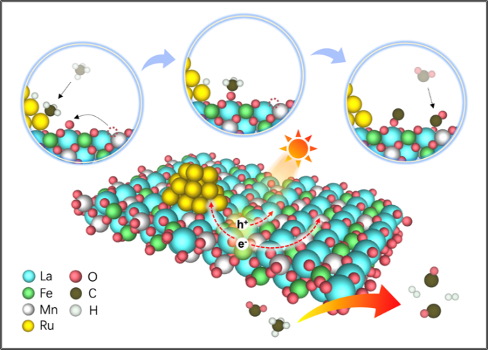 Ru/LaMnFeO的光热DRM反应路径示意图
