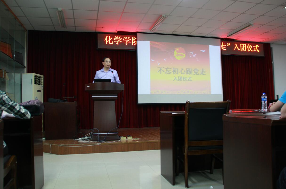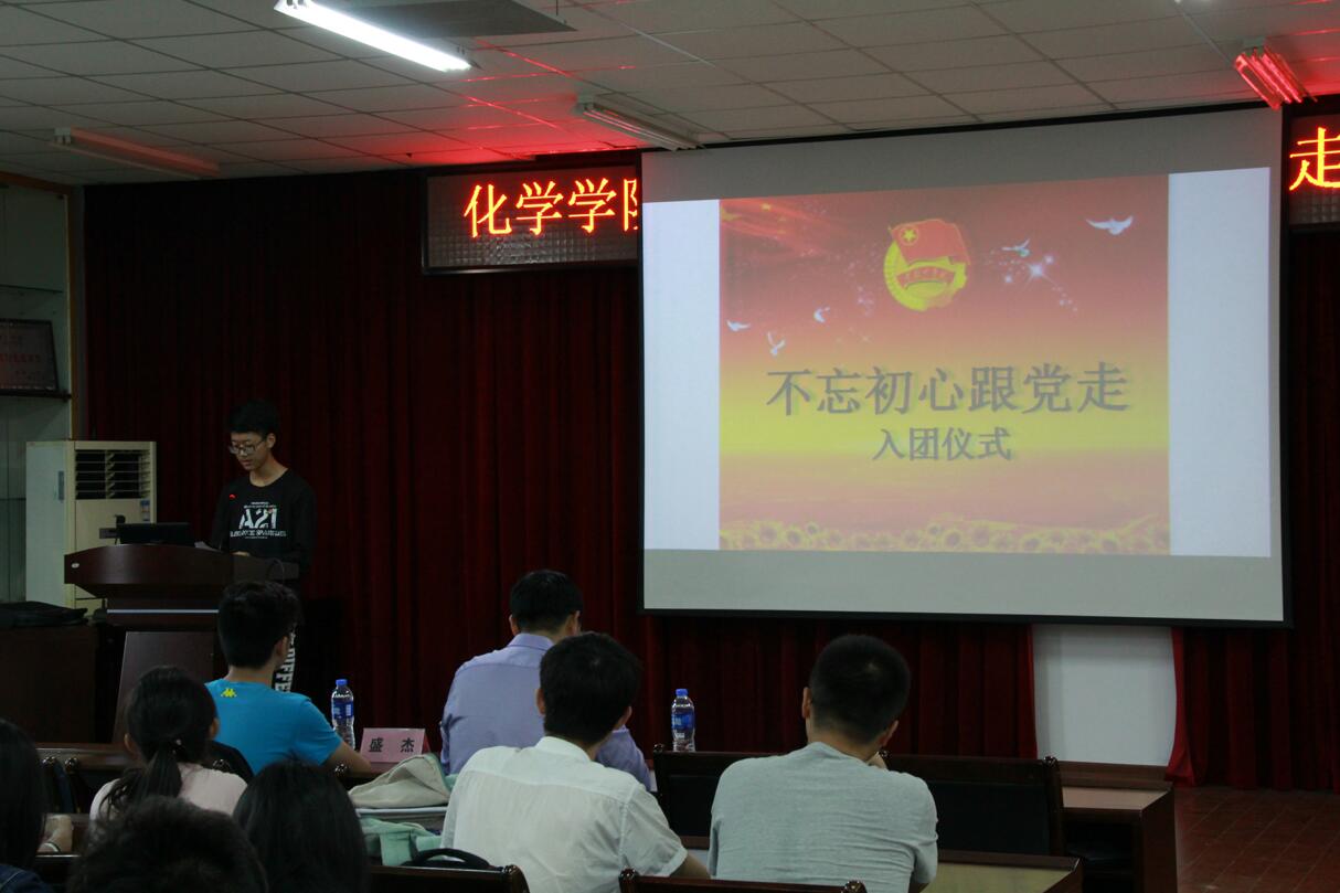 这次仪式以国歌开始,在“前进,前进,前进进”的号角中,我们感受到团的号大力量。然后在主持人说明举行入团仪式的意义,宣布新团员的名单后,蓝荣聪书记为这些新团员颁发了团章、团员证、团徽,并一起合影留念。紧接着,由16级化学一班的团支书陈佳禾带领大家一起宣誓,并由16级化学2班班长张熹宣读《团章》,让新团员了解到自己的权利和义务,争做一名合格的团员。接下来是由新团员代表制药工程班班长邓睿发言,他展望了自己作为一名优秀团员的未来,并树立了坚定的为人民服务的信念。老团员代表盛杰学长也被邀请发言。他回忆自己的作为一名团员的过去,道出了作为一名团员的身上肩负的重任――我们是标杆,是榜样。我们不仅要为班级做贡献,更要为学院,为学校做出自己的贡献,起到一个先锋模范的带头作用。最后由团委书记蓝荣聪发言,首先他对这些入团新团员提出了热烈的祝贺,然后他道出了此次仪式的重要意义:1、坚定理想和信念。所谓理想,即为解放全人类最后到解放自己;所谓信念,即为要在共产主义的道路上坚定不移的走下去。2、坚定理论学习。作为党的助手,后备军,我们只有积极学习了理论知识,才能做一名合格的建设者和可靠的接班人。3、做一名有担当的青年团员,永远保持为人民服务的觉悟。