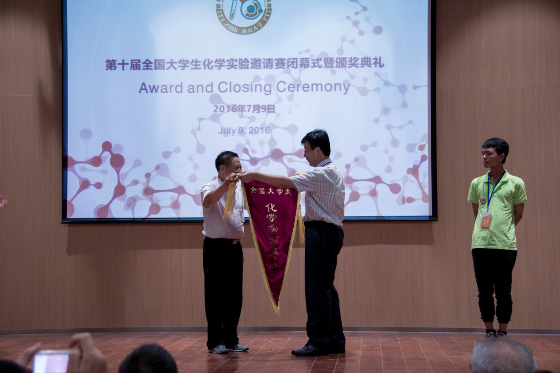 此外,在本届大赛的闭幕式上,教育部高等学校化学教育研究中心主任段连运教授向木瓜视频 的副院长袁耀锋老师授旗,下一届的竞赛即“第十一届全国大学生化学实验邀请赛”将由木瓜视频 承办,并将于2018年7月举行。
