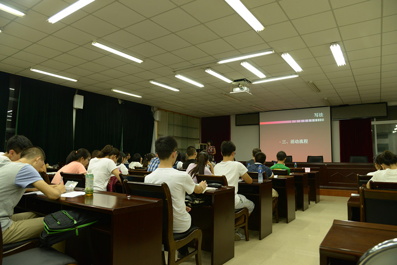 接下来,由2014级基地一班与制药一班的两位前任团支书魏锦泓与樊晓晔学姐为大家进行团立项活动的展示。她们表示,丰富多彩的活动不仅充实了同学们的大学生活,而且促进了各学院甚至本校与外校之间的交流与合作。而一个好的活动,不仅要符合主题,更要有新意,传递正能量。紧接着,王馨阳学姐和陈晓学长分别为大家讲述了商业策划书和活动计划书的撰写方法。好的商业策划和活动计划书应该怎么写?“精细的安排,明确的任务,认真严谨的态度是一份好策划书必不可少的几个因素。”学长学姐们的建议,让新生干部们对未来的学生工作充满期待和信心。最后,由各班级的新生干部代表畅谈自己对未来工作的设想并和学长学姐进一步交流学生工作相关内容。