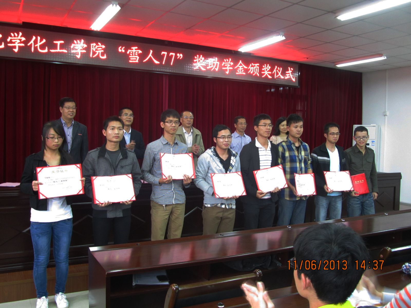 2013年11月6日下午,化学化工学院“雪人77”奖助学金颁授仪式在嘉锡楼413会议室顺利举行。出席本次颁授仪式的有77级校友代表、福州市科技局郑寿平副局长,福建雪人股份有限公司人事部曹雪飞经理,化学化工学院李学来教授,化学化工学院党委施卫华副书记,团委书记陆莉莉老师,及化学过程装备与控制工程专业学生。颁奖仪式由党委副书记施卫华主持。