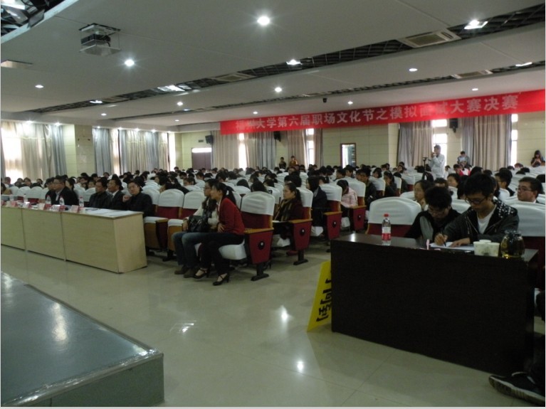 学生职业发展协会联合主办的第六届模拟面试大赛决赛在素质拓展中心的学术报告厅隆重举行。本次比赛特别邀请到福建中海创集团大学常务副校长肖子阳校长,惠好医药集团人力资源部总监刘科富先生,中国民生银行福州分行仓山支行副行长潘广志行长,福建网龙网络有限公司校园招聘主管詹铭敏先生以及木瓜视频