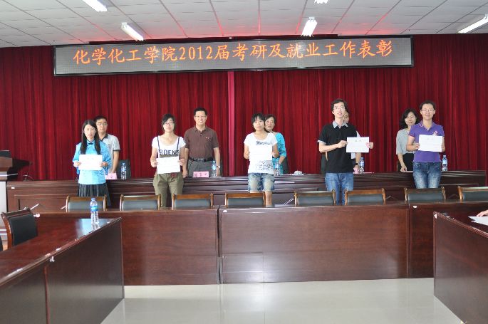 大会分为四项议程,首先由施卫华副书记宣布了2012届化学化工学院考研优秀学生名单以及2012届就业工作先进班级。其次对获奖的人员以及班级代表进行了颁奖。再次,由获奖的同学及班级代表发表了获奖感言。最后,施卫华副书记对本次会议进行了总结。