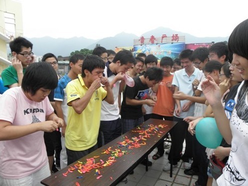 上午8点半,趣味运动会正式开始。运动员们各就各位,摩拳擦掌,蓄势待发。此次趣味运动会共设有:吹爆气球、毽子接龙、二人跳绳、五人六足、海底传月5个项目。比赛看似简单,实则不易。吹爆气球,考验肺活量,更考验胆量;毽子接龙、二人跳绳、五人六足、海底传月挑战速度,更挑战协调程度。丰富多彩的运动项目调起了同学们的每一个运动细胞。场上运动员们尽情挥洒,场下观众则频频报以欢笑和热烈的掌声,现场气氛十分热烈。经过2个半小时的角逐,裁判组评出了一、二、三等奖获奖队伍,并发给精美奖品。