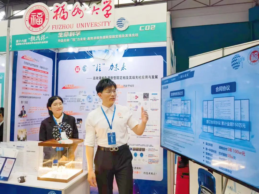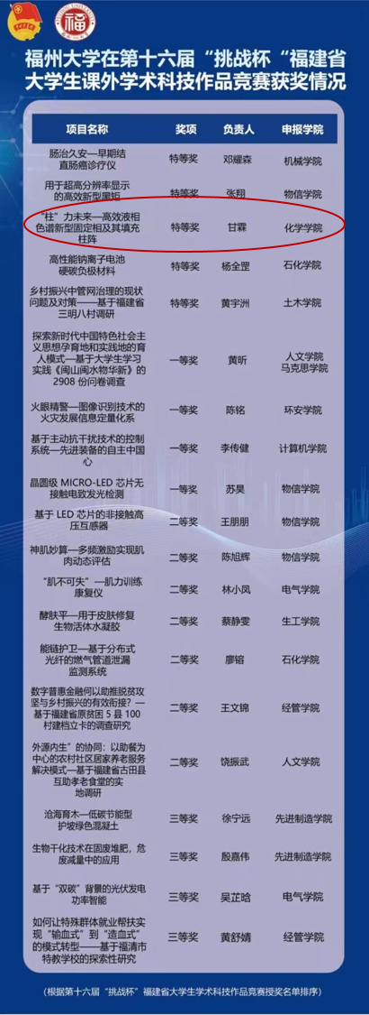 5月28日,第十六届“挑战杯”福建省大学生课外学术科技作品竞赛决赛于福建农林大学落下帷幕。本届大赛共有全省61所高校推报的1343件作品进入省赛,经过网评、复评等环节,最终143件作品闯入决赛。由林子俺副院长指导、郑寿添院长大力支持的创新创业项目《“柱力未来”——高效液相色谱新型固定相及其填充柱》获得省挑战杯(大挑)特等奖(全省各学科组别合计仅25个特等奖),进军国赛!