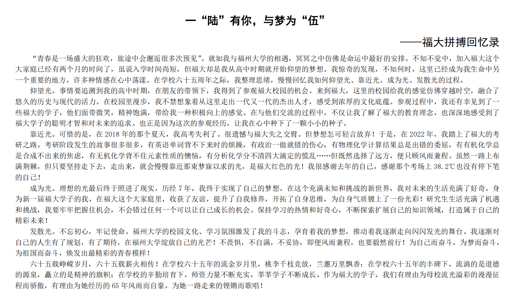 开展了“金秋共迎校庆,青春告白福大”迎校庆主题活动。化院学子纷纷提笔,为福大65周年诞辰送上最真挚的祝福。本次大赛共计收集了65份优秀作品,经过评审团的投票评选,最终评选出15份优秀作品!让我们一起欣赏这些同学们字里行间蕴含的深厚情感,感受照片中记录的动人片刻吧!
