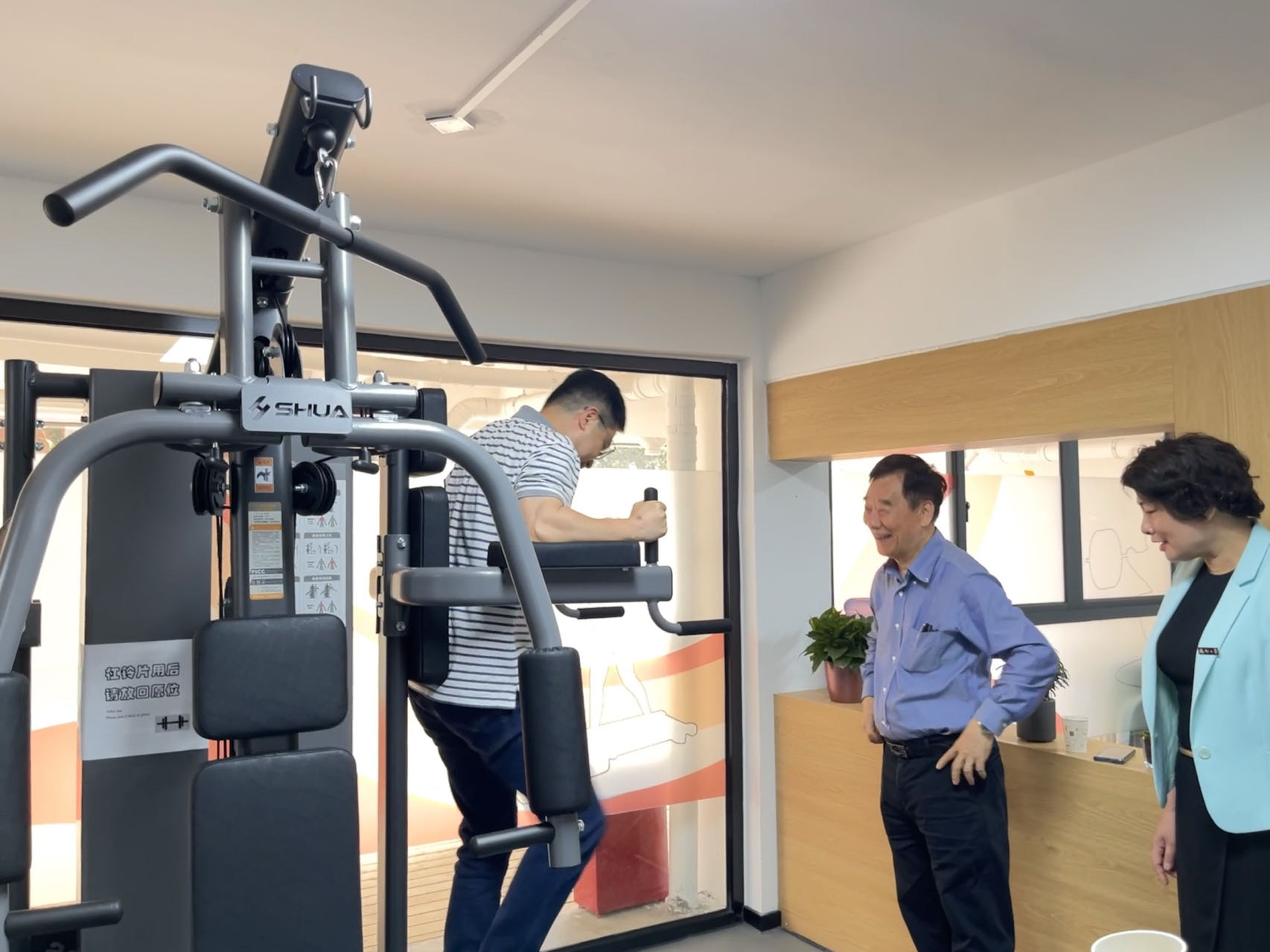 随后,杨鸿耀先生及其夫人杨赛芳女士共同参观了室外休闲共享空间、水吧台、器械室和瑜伽室等场所。