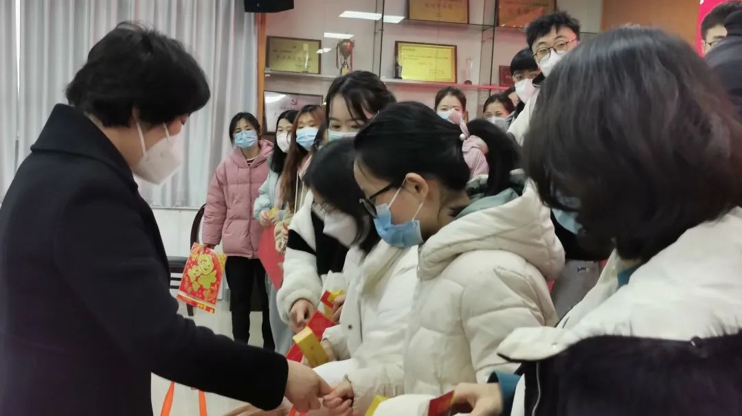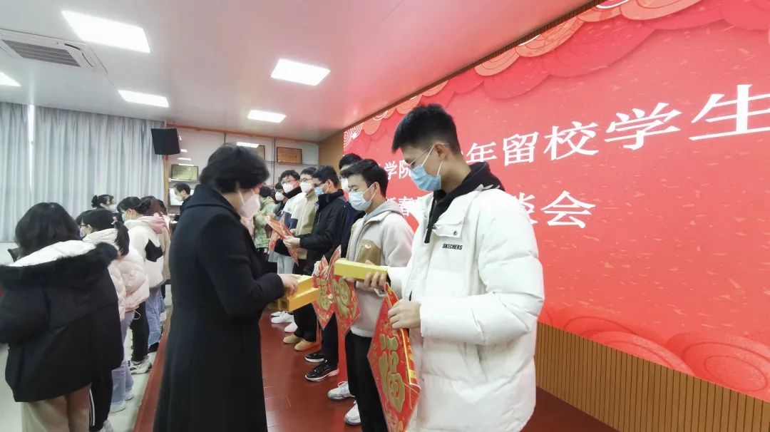 最后,学院领导给留校学生代表赠送了“新春暖心大礼包”,并为留校学生送上了新春对联和福字贴,把最美好的新春祝愿送给每位留校学生。