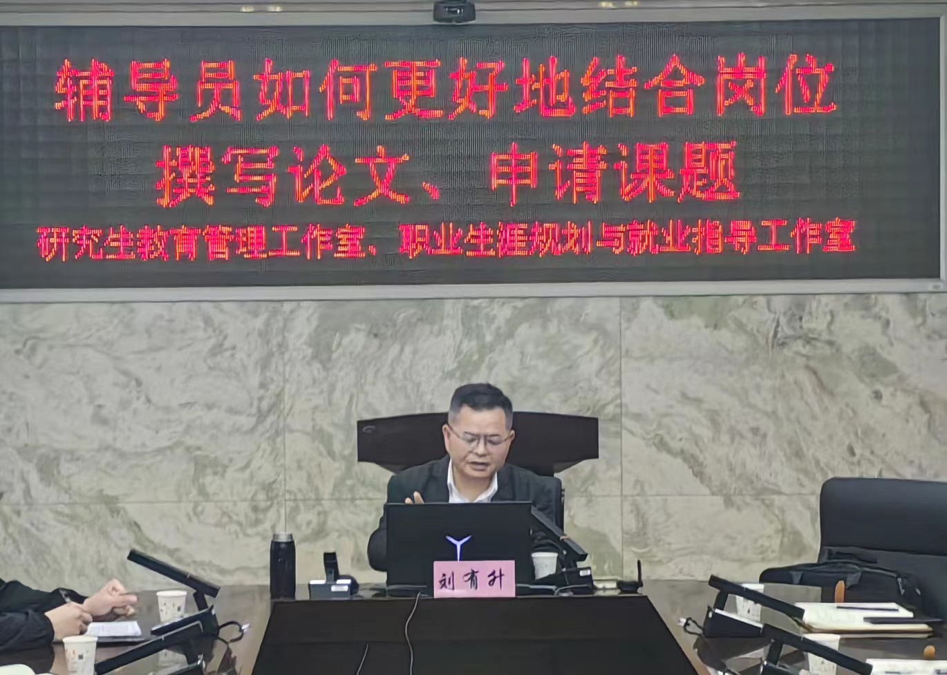 为进一步推动辅导员队伍建设,切实提升辅导员的专业素养,特别是提升辅导员结合岗位撰写论文、申请课题的能力水平,2024年3月18日下午,研究生教育管理工作室联合生涯规划与就业指导工作室组织开展辅导员科研能力提升培训活动。本次活动邀请马克思主义学院副院长刘有升教授作《科研素养提升:理论与实践的融合》专题讲座。两个工作室全体成员在物信学院祥联厅参加活动,异地校区在线参加。