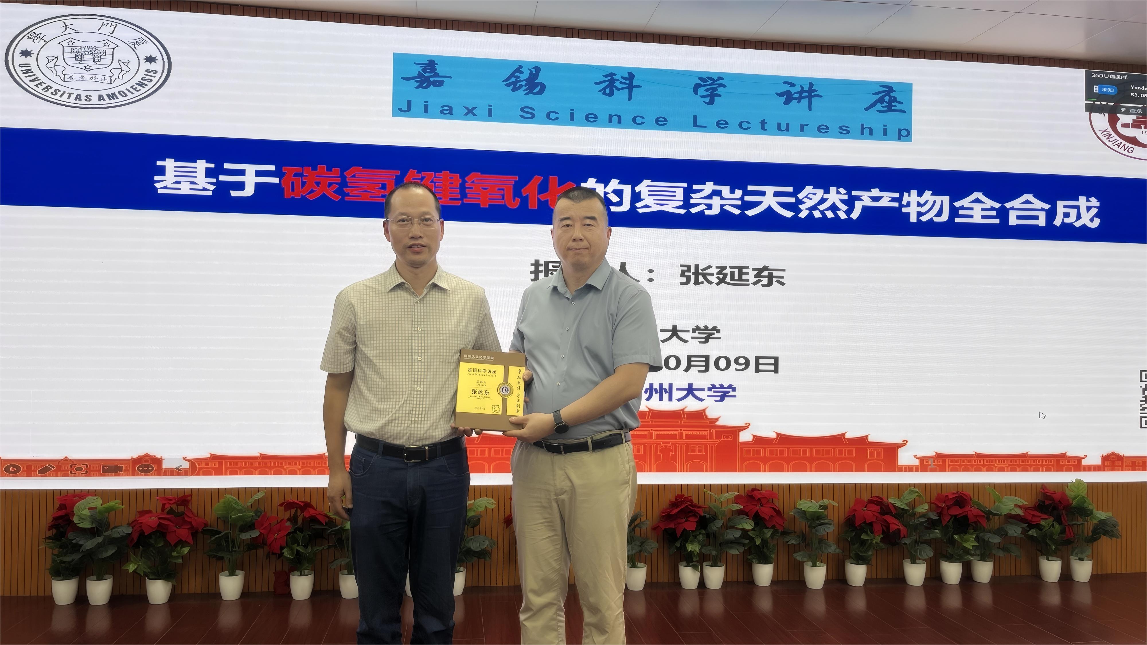 有机合成与功能研究所邀请,担任嘉宾做专题报告。学院院长钟羽武代表学院,向张延东教授颁发嘉锡科学讲座主讲人荣誉证书。