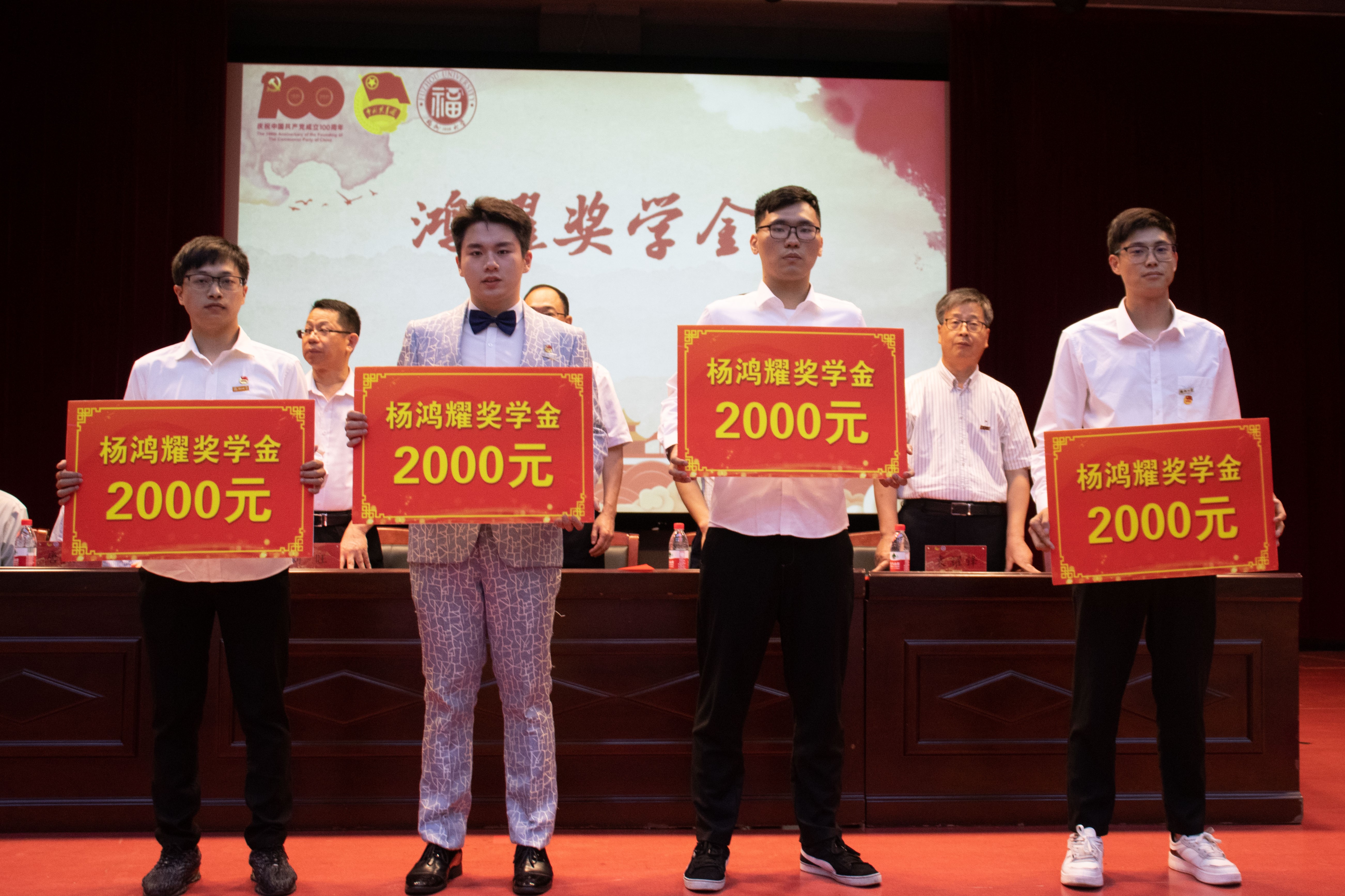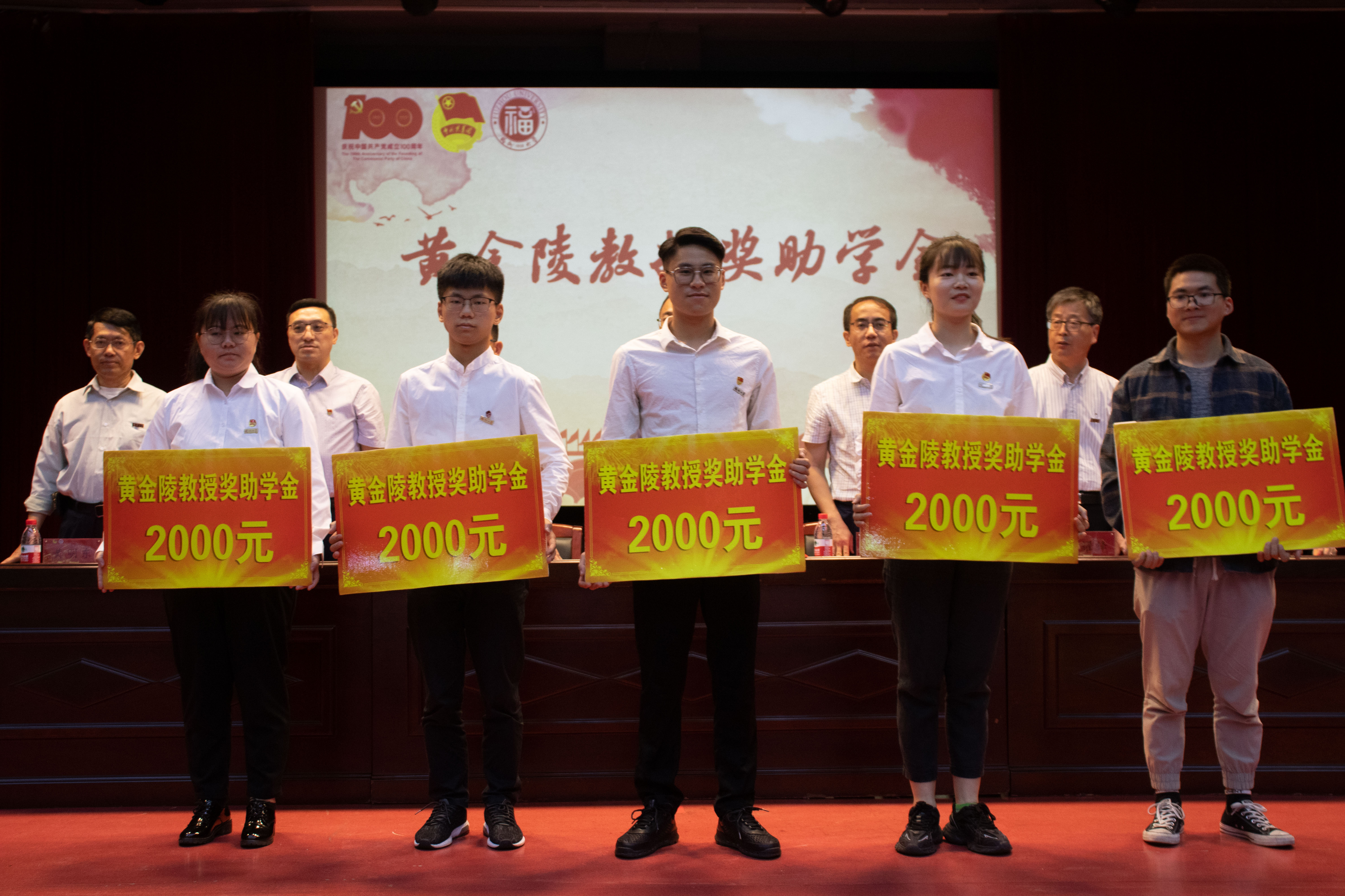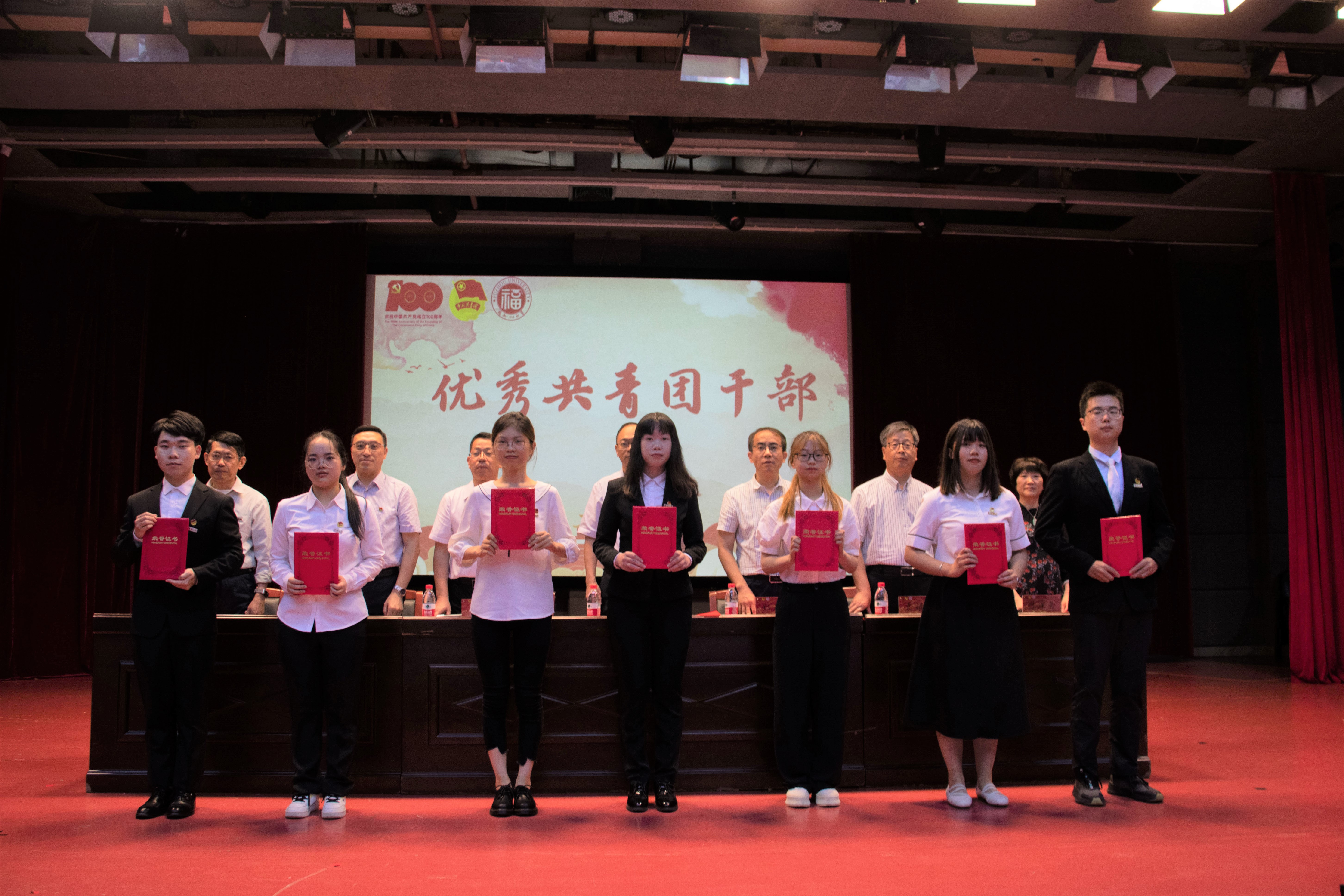 袁耀锋副院长宣读五四表彰决定,公布荣获“五四红旗团支部”的团支部和校“十佳”、校“先进个人”的评优名单,以及福建省“向上向善育人工程基金”奖学金、鸿耀奖学金、黄金陵教授奖助学金、考研奖学金获奖同学名单。随即各组同学代表依次上台领奖,台上领导为他们颁奖。
