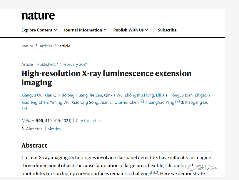 杨黄浩教授、陈秋水教授课题组的合作研究论文“High-resolution X-ray luminescence extension imaging” (Nature, 2021, 590, 410-415),《Nature》杂志同期发表述评指出此项研究极大地推动了X射线成像技术发展(News & Views),标志着我国在柔性X射线成像技术方面进入国际先进行列,并有望突破国外的技术限制,推进高端X射线影像装备的国产化。这是继杨黄浩教授研究团队在2018年实现木瓜视频