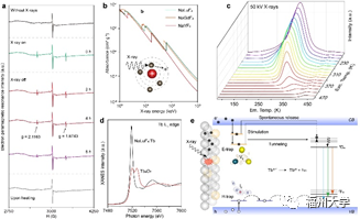 为攻克这一关键技术瓶颈,杨黄浩教授、陈秋水教授及其合作者发现了一类高性能X射线发光纳米闪烁体,通过结合光谱技术、电子顺磁共振表征、热释光学曲线分析、密度泛函理论计算、同步辐射技术对晶格缺陷的本质展开研究,提出了高能量X射线光子诱导缺陷产生长余辉发光的机理(图1)。该发光机制的建立对新型卤化物长余辉材料的探索与合成具有指导意义。