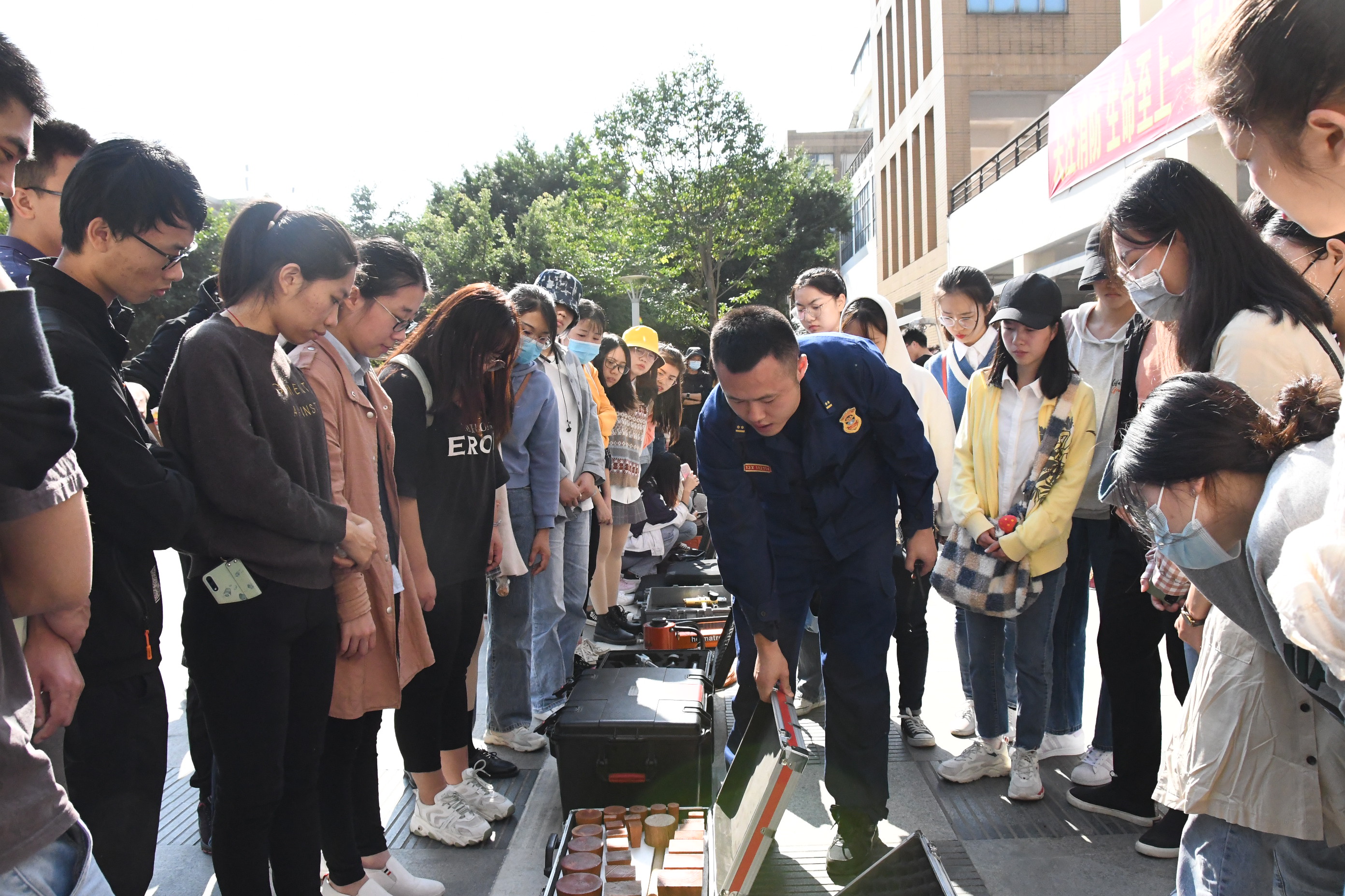 消防指战员们向师生讲解了各类特种救援装备及消防员个人防护装备的性能及用途,并现场指导师生实地体验灭火器的使用。