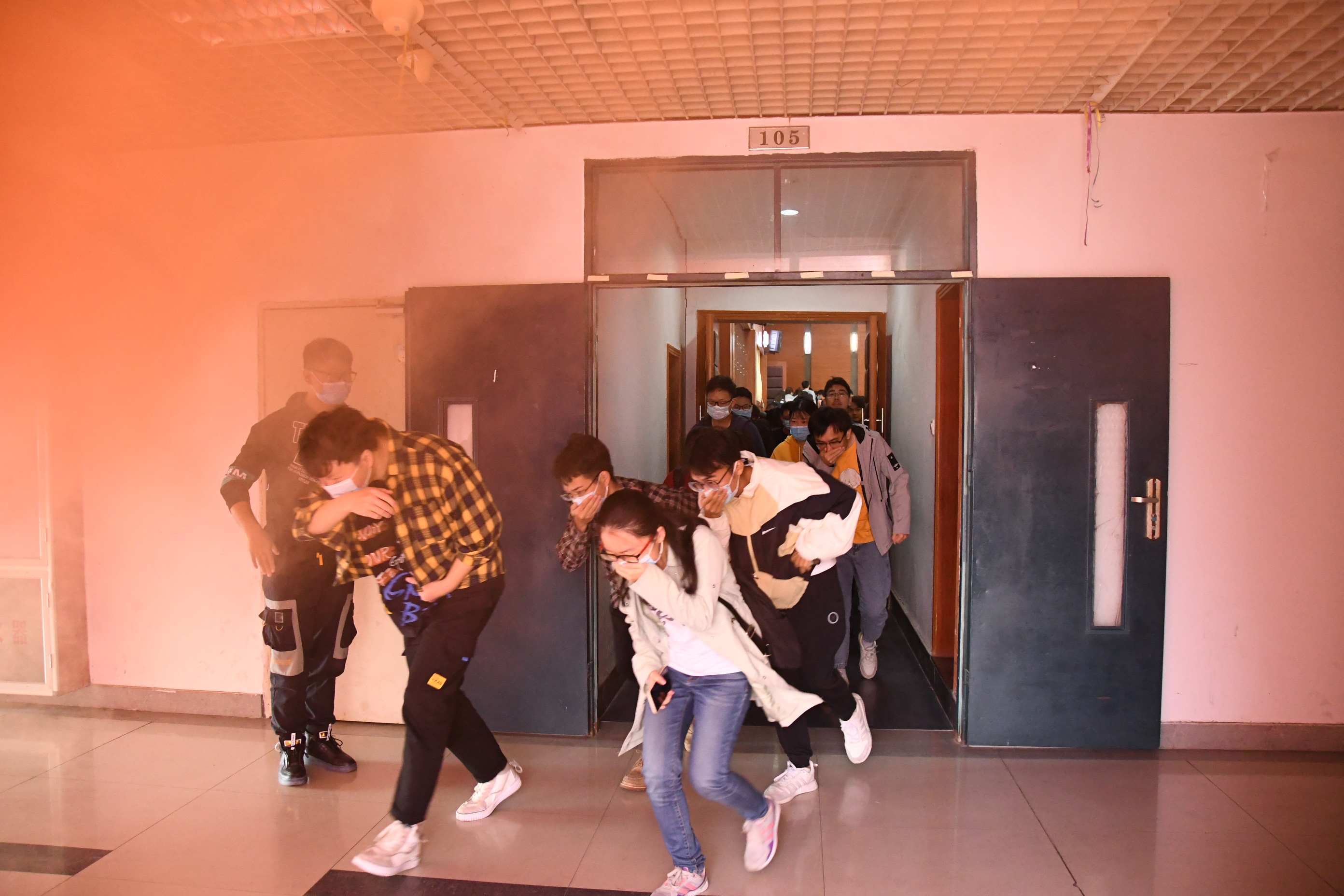 “着火啦!着火啦!”正在认真聆听讲座的老师和学生们听到火灾警报,顿时,会场浓烟滚滚。原来,这是模拟会场突发火灾,接到警报的学生迅速用衣物捂住口鼻,弯腰扶墙,在疏导员的引导下有序撤离火灾现场。