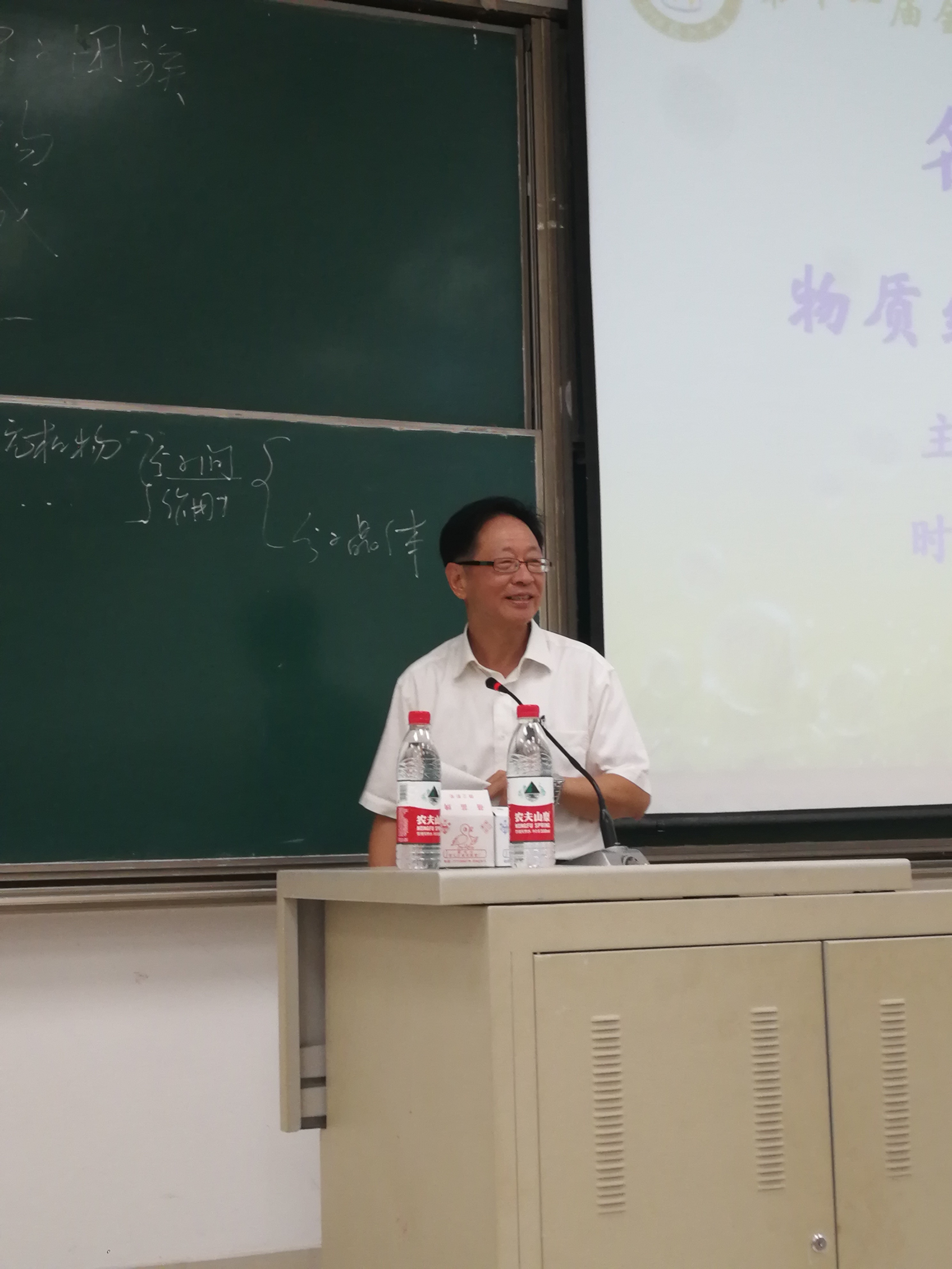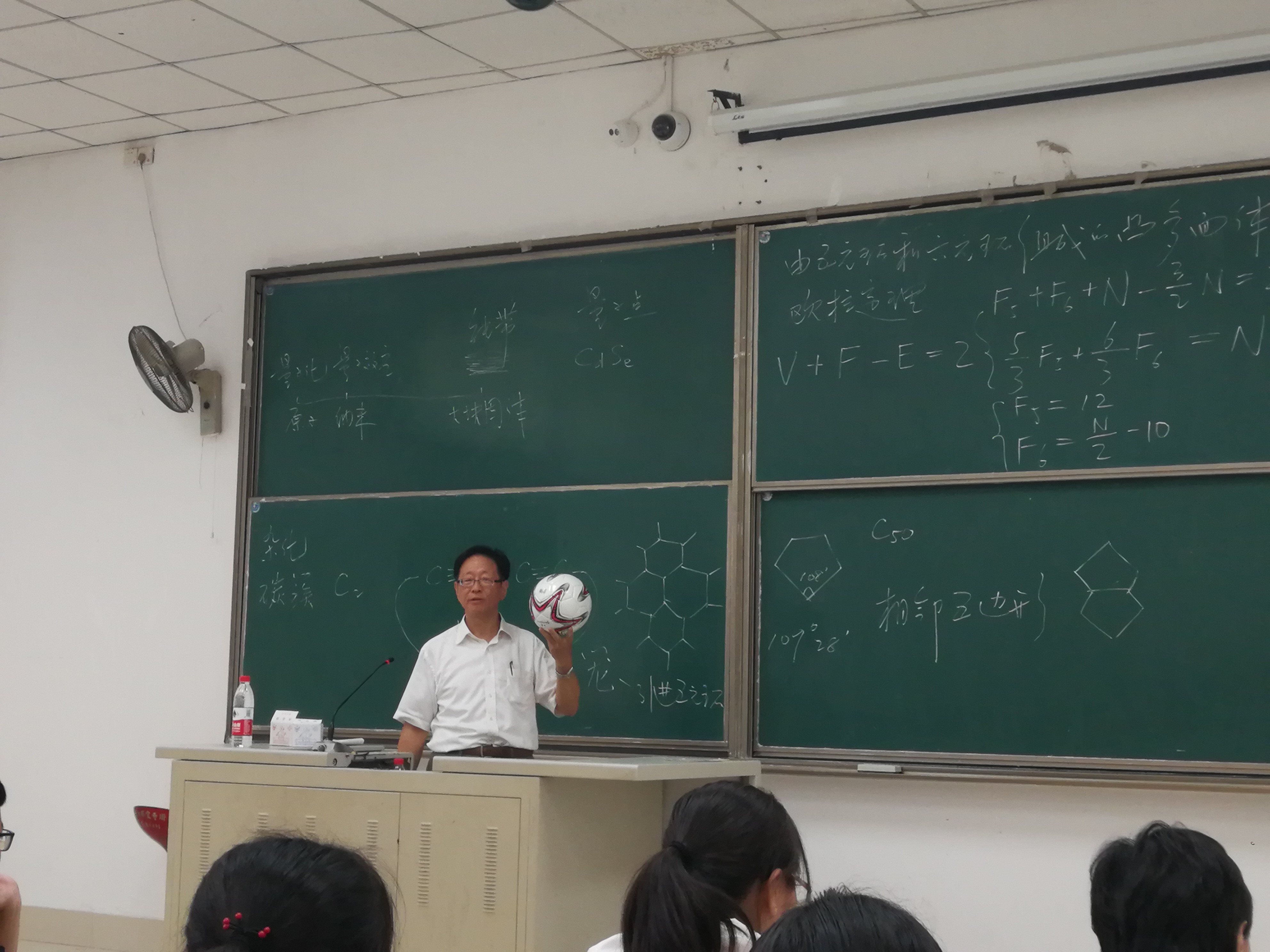 郑院士从构成物质的共价键、离子键和金属键开始论述物质的组成结构,拓深延展到非分子物质-原子团簇,引领老师、同学们在化学知识的海洋里畅游。一个个深奥的化学概念经过郑院士深入浅出的讲解变得浅显易懂。当讲到原子团簇的时候,郑院士以手中的足球为例生动形象地解释了C60为什么由多个六边形和五边形组成并能够稳定存在的原因。三个小时的讲课中,年近花甲的郑院士一直站立授课。讲授过程中,全程粉笔黑板板书,板书工整整齐,且多次亲手擦去再写,整个授课过程写满黑板, 让老师、同学们领略到一种学养深厚又平易谦和的大师风范。